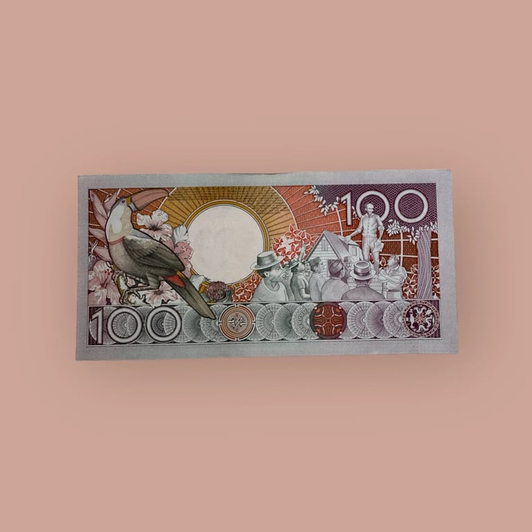 Reverse: an Agricultural scene depicting cattle herder and palm trees to centre left. The denominational value in words is seen to the left corner and in numbers in three corners. Text “Central Bank Of The Gambia” at the top. Dominant Colour: Red and Orange.