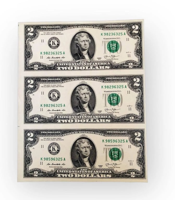 United States of America Issue $ 2 UNCUT 3 Piece GEM UNC Unique and Rare Tope Collectible Item USA