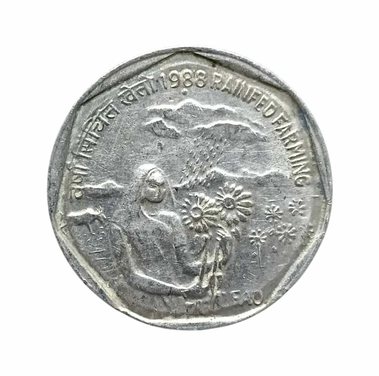 This is a 1 Rupee commemorative coin issued by India in 1988 to promote Rainfed Farming. Below are the detailed specifications and features of this coin: