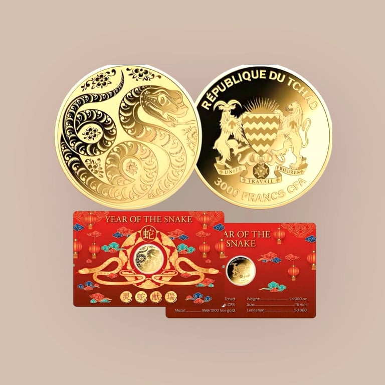 This charming Gold coin is dedicated to the Chinese zodiac sign of the Snake, known for being smart, wise, determined, and caring. People born under this zodiac sign value knowledge, work hard to achieve goals, and form deep bonds in relationships. This Gold coin is beautifully packaged in a blister, with the Certificate of Authenticity embedded on its back. Limited mintage of 50.000 pieces worldwide! The reverse of this Gold coin depicts the Chinese zodiac sign of the Snake, meticulously detailed and adorned with a beautiful Chinese pattern. The obverse of this Gold coin depicts the Coat of Arms of Chad and the inscriptions: "REPUBLIQUE DU TCHAD" – the issuing country, and "3000 FRANCS CFA