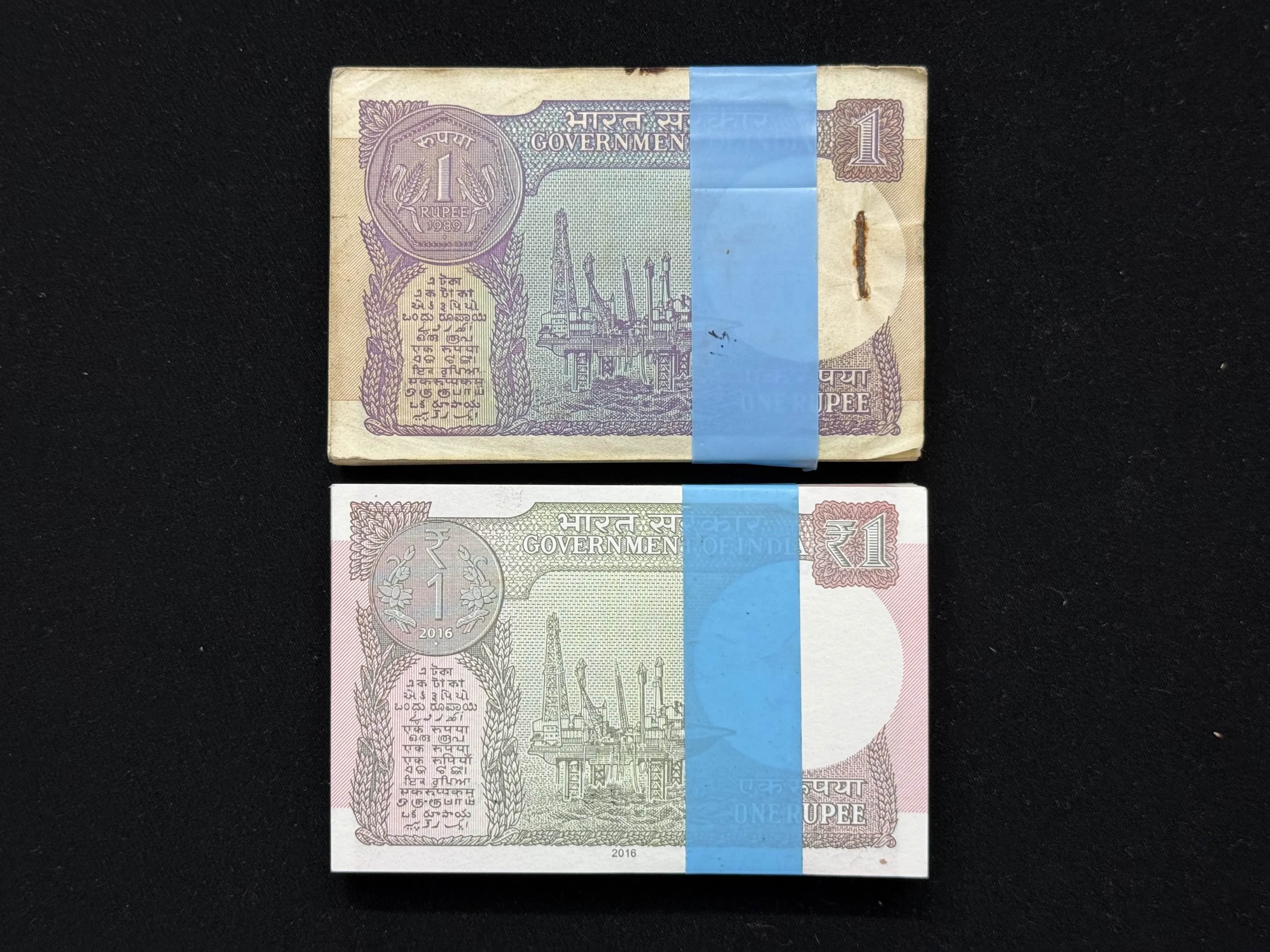 India, 1989 & 2016 Rupee 1 Complete Serial Bundle of 100 Notes, Pair of Same Serial Bundle, Holy Fancy Serial Number 400-786, Sign. Gopi K. Arora & Ratan P. Watal, SCARE, (16C 400701)