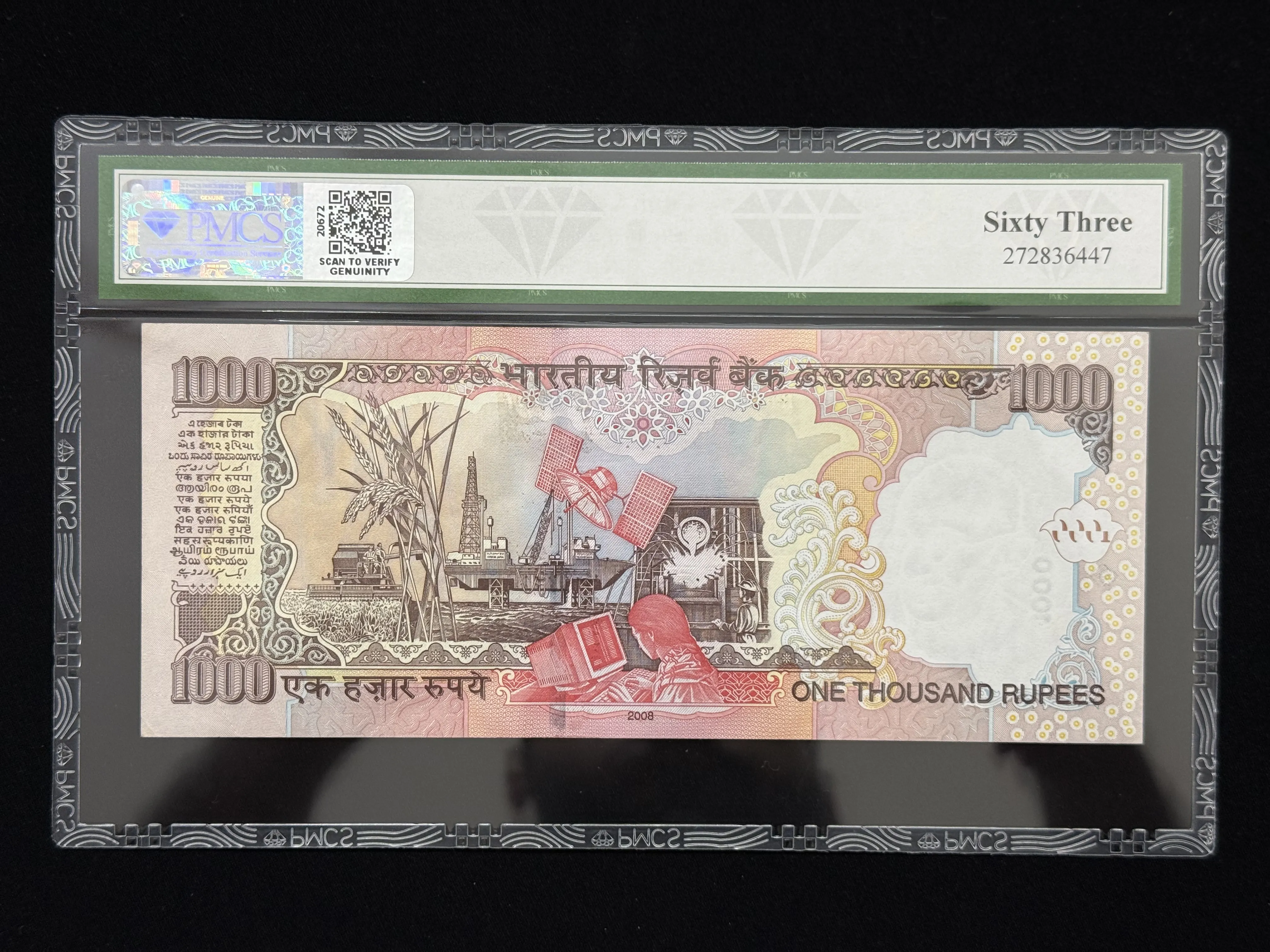 India, 2008 Rupees 1000 Banknote, Fancy Serial Number 600000, Sign. Y.V. Reddy, Inset Plain, PMCS Graded 63 UNC, (4DG 600000)