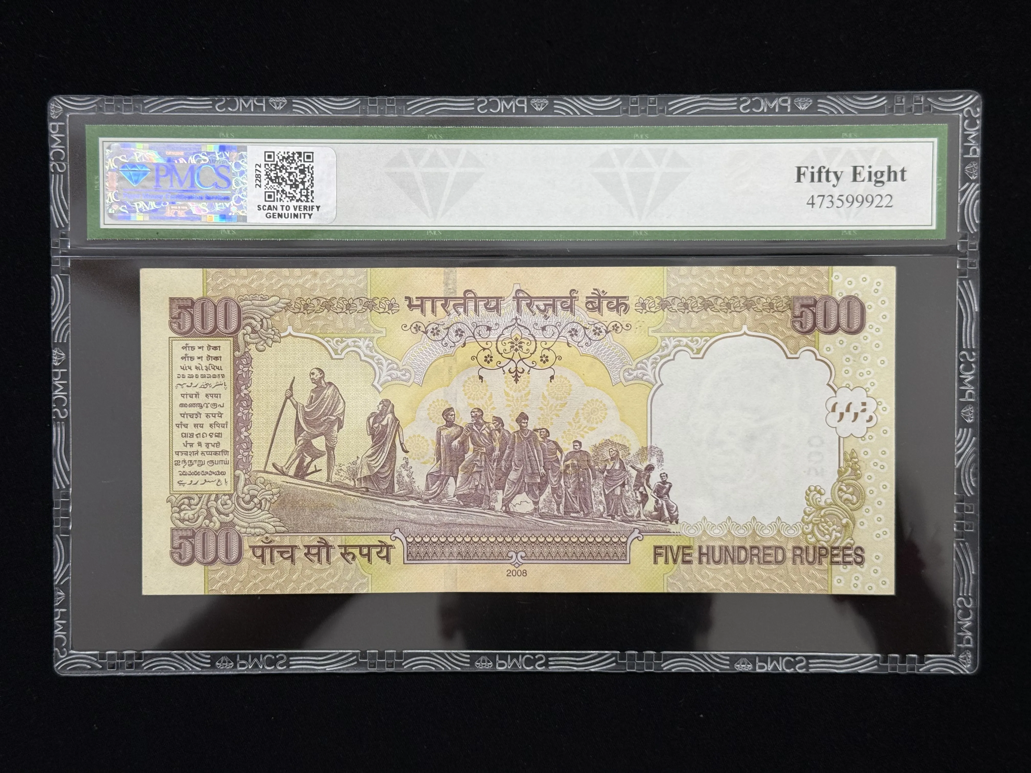 India, 2008 Rupees 500 Banknote, Solid Fancy Serial Number 111111, Sign. Y. V. Reddy, Inset Plain, PMCS Graded 58 AUNC, (4HN 111111)