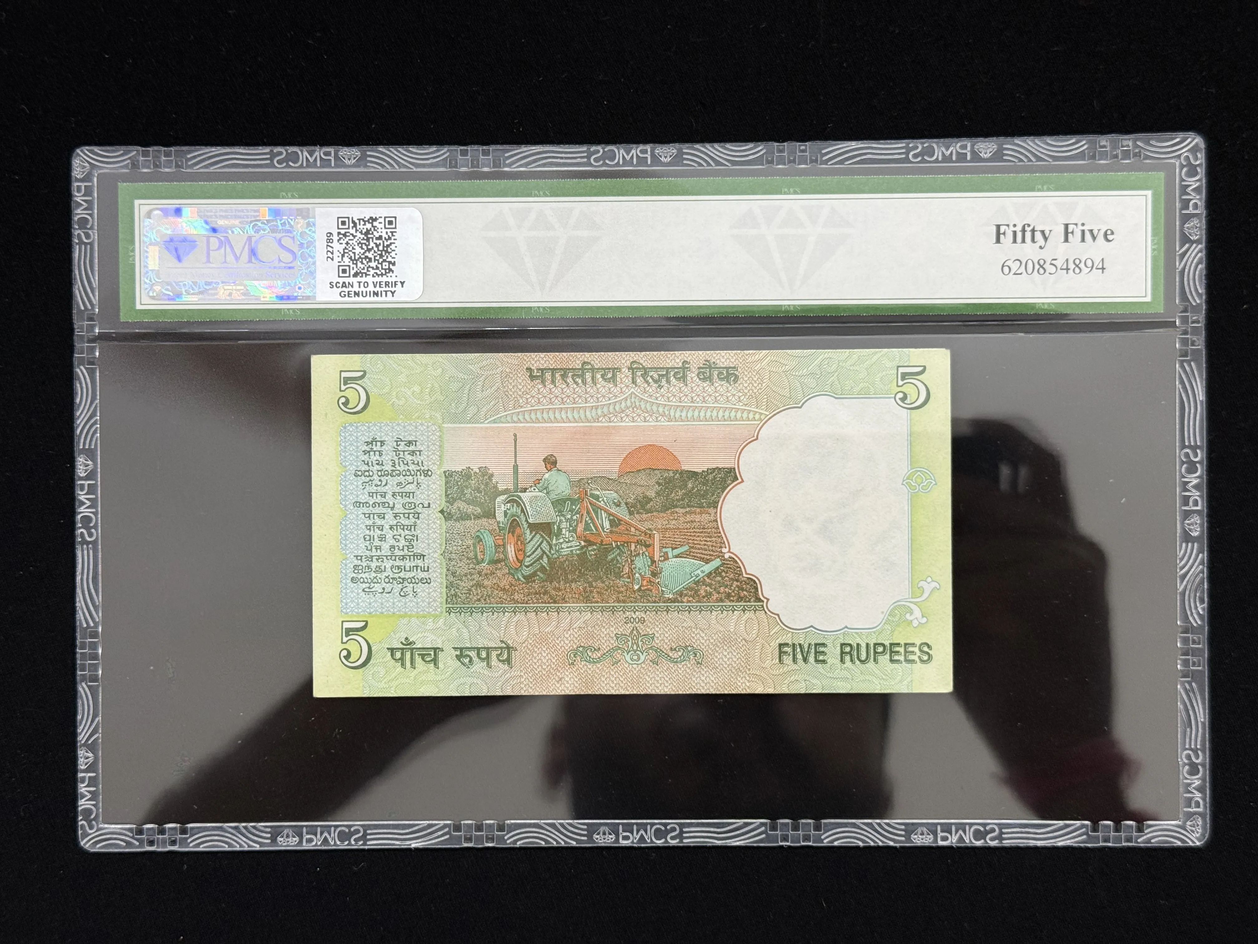 India, 2009 Rupees 5 Banknote, Fancy Serial Number 600000, Sign. D. Subbarao, Inset E, PMCS Graded 55 AUNC, (41C 600000)