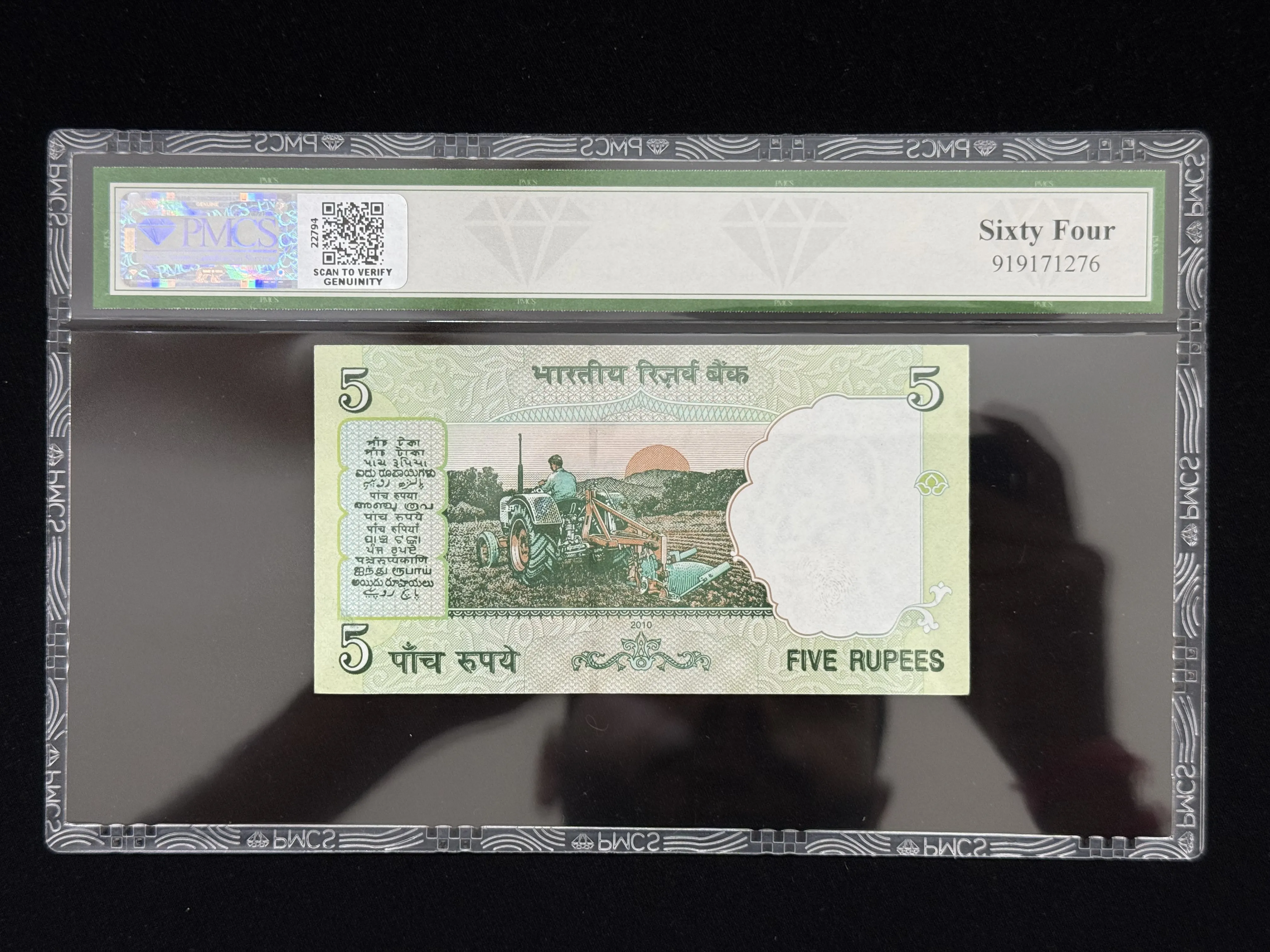 India, 2010 Rupees 5 Banknote, Fancy Serial Number 400000, Sign. D. Subbarao, PMCS Graded 64 UNC, (09B 400000)