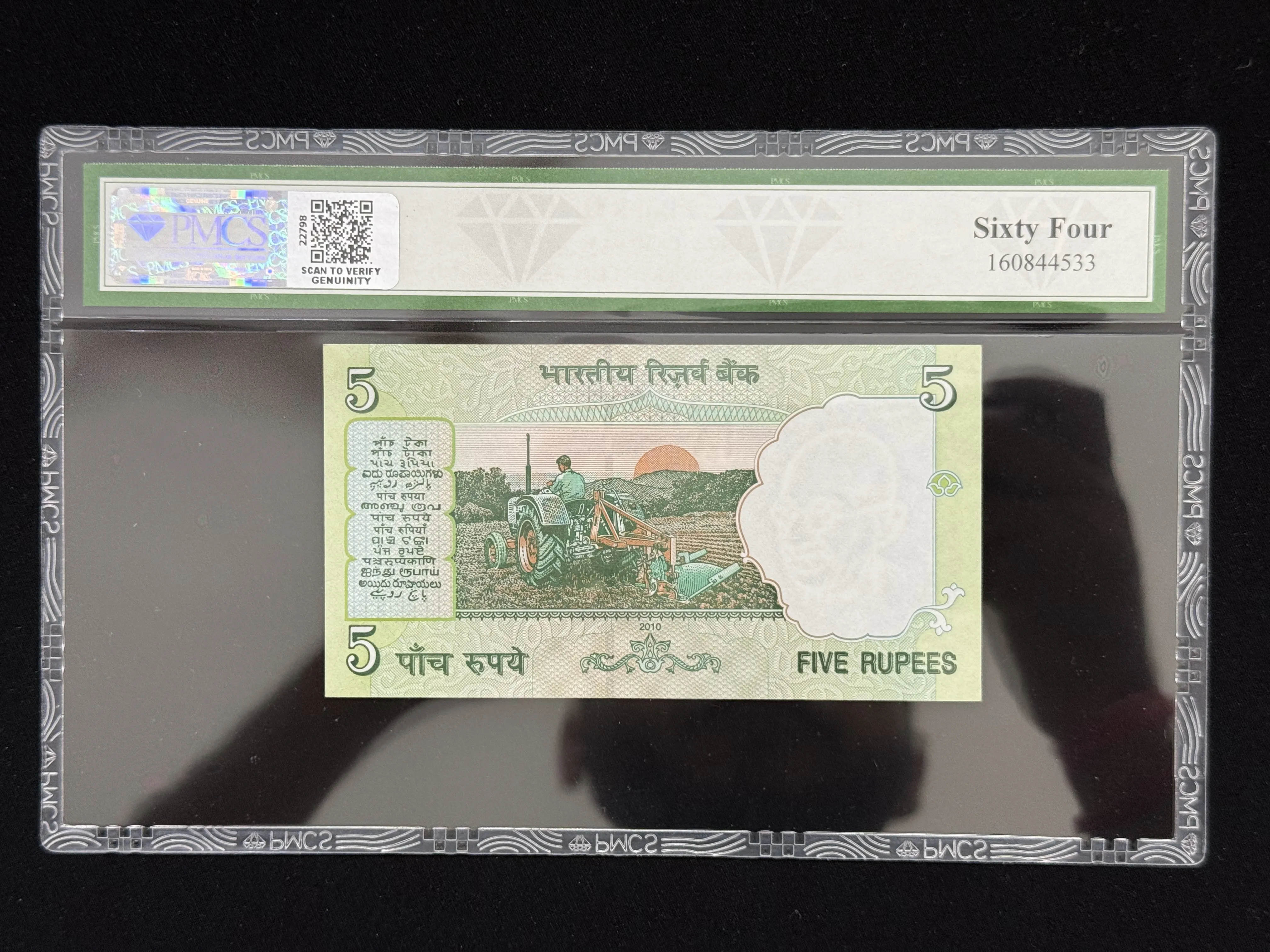 India, 2010 Rupees 5 Banknote, Solid Fancy Serial Number 666666, Sign. D. Subbarao, Inset R, PMCS Graded 64 UNC, (45A 666666)