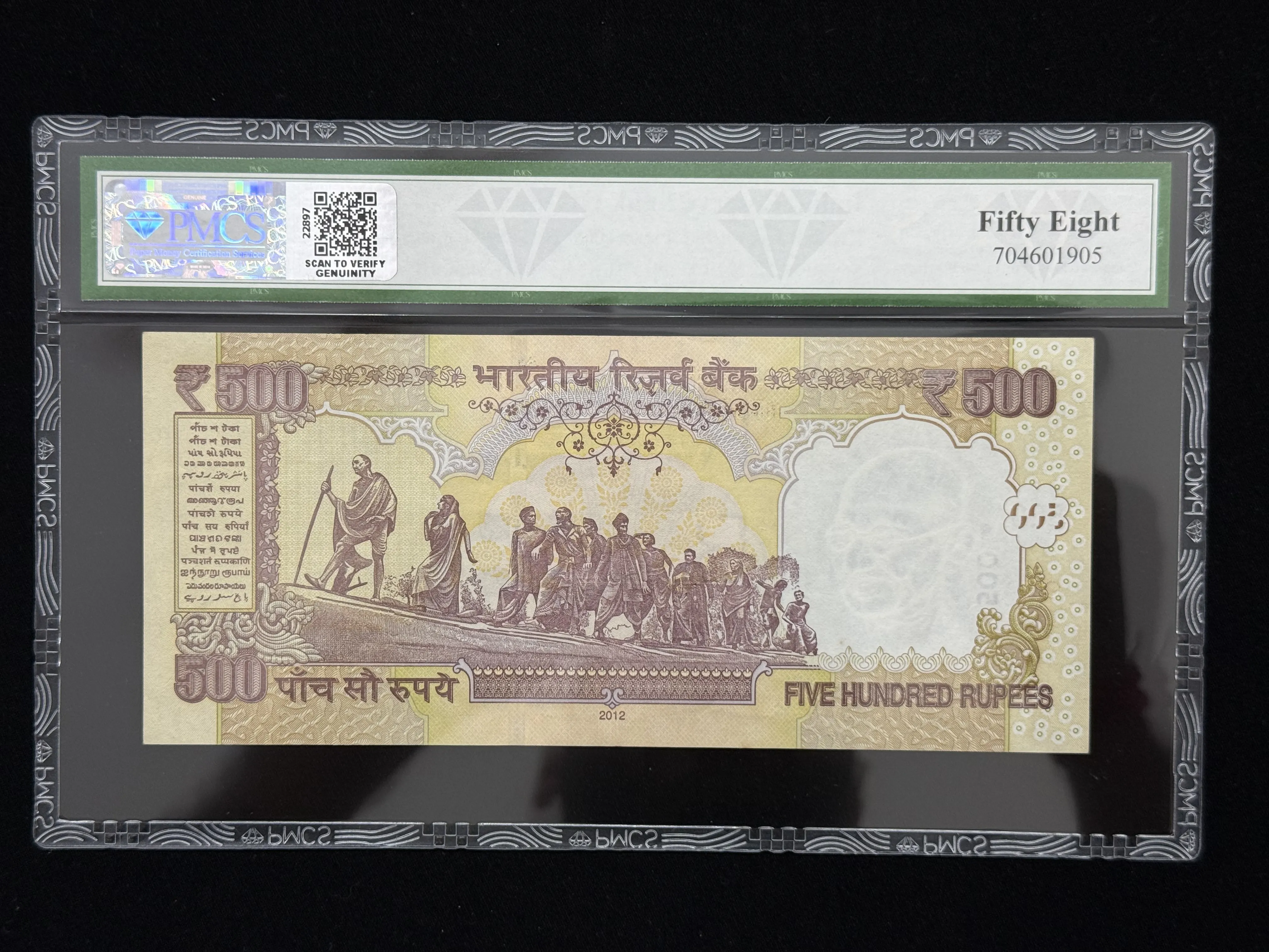 India, 2012 Rupees 500 Banknote, Solid Fancy Serial Number 222222, Sign. D. Subbarao, Inset Plain, PMCS Graded 58 AUNC, (0FN 222222)