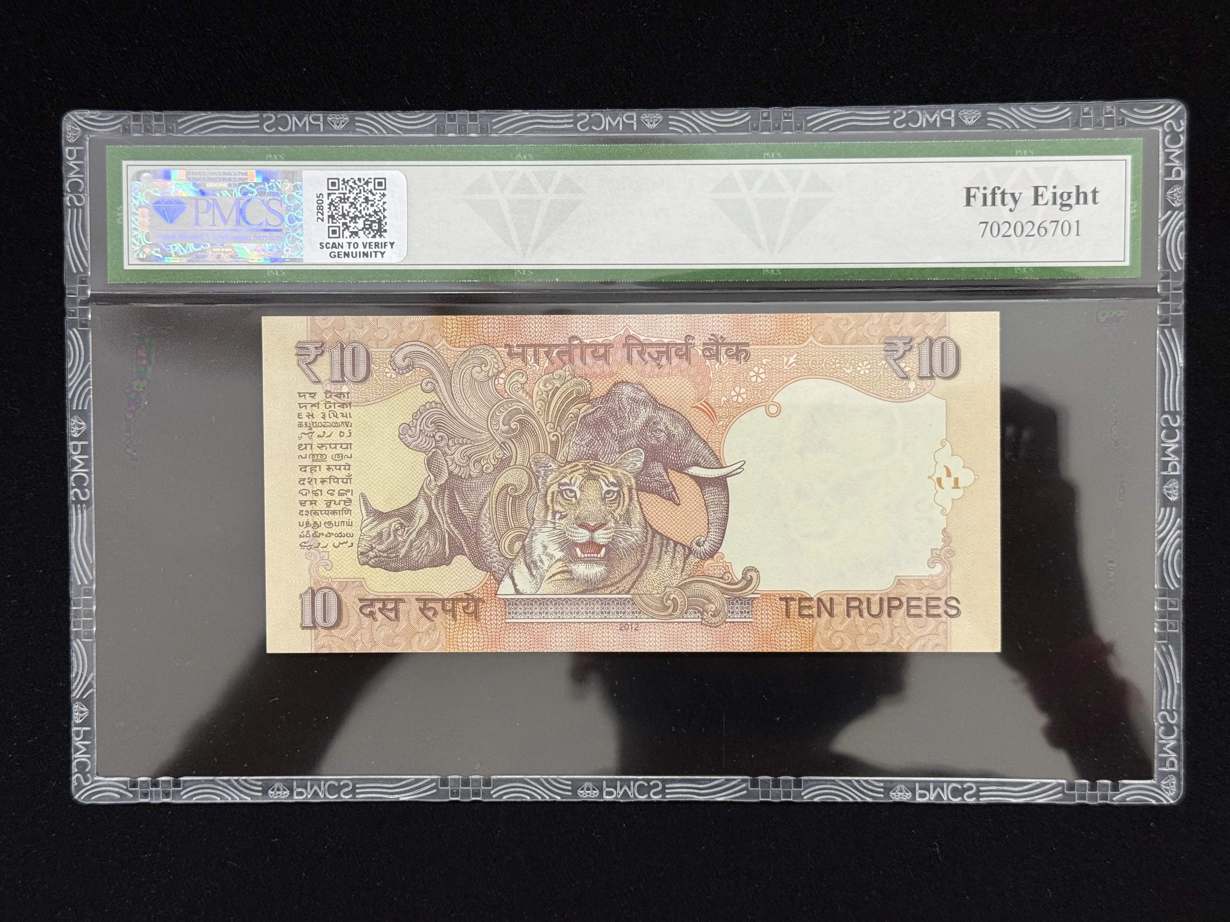 India, 2012 Rupees 10 Banknote, Holy Fancy Serial Number 000-786, Sign. D. Subbarao, PMCS Graded 58 AUNC, (25A 000786)