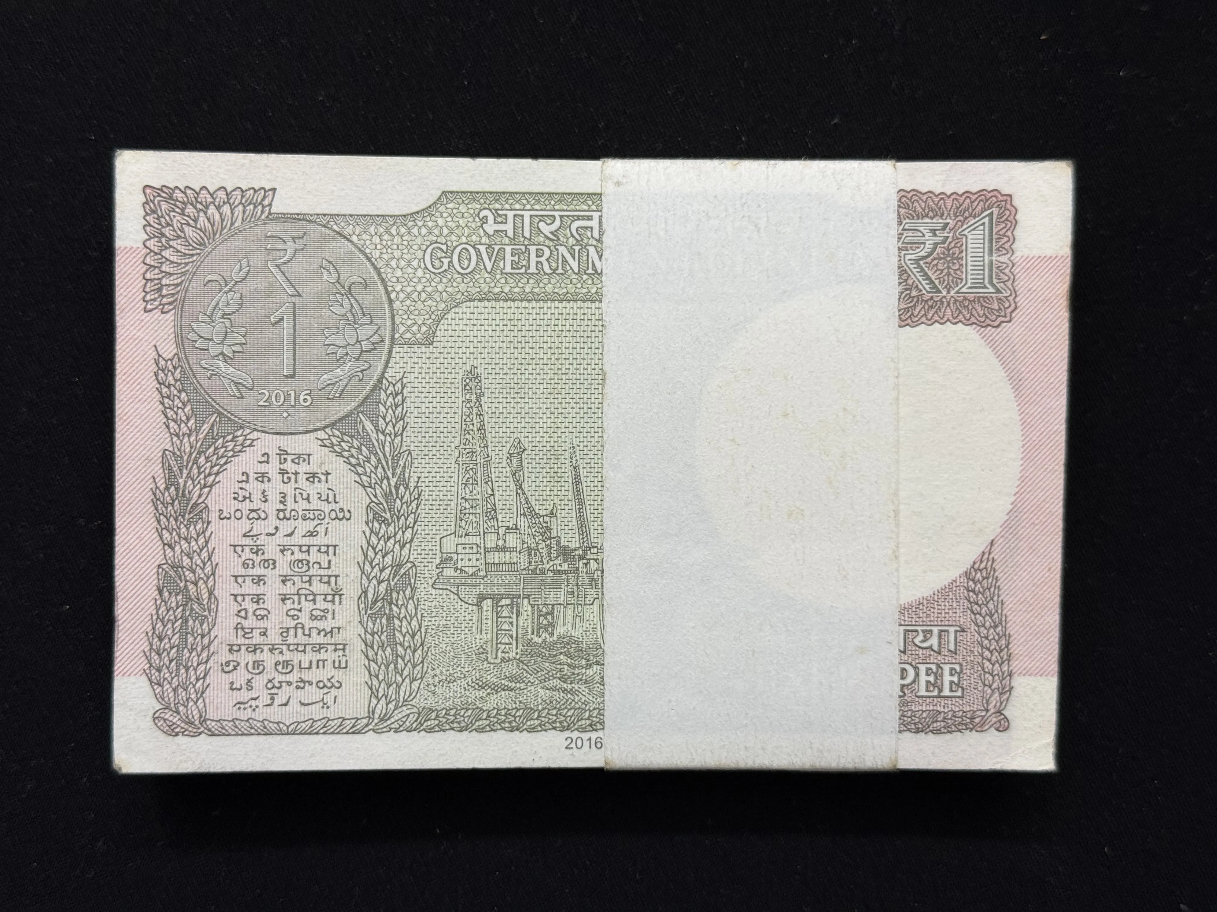 India, 2016 Rupee 1 Complete Serial Bundle of 100 Notes, Fancy Ladder Serial Number 65-078910, Sign. Ratan P. Watal, UNC, (65A 078901)