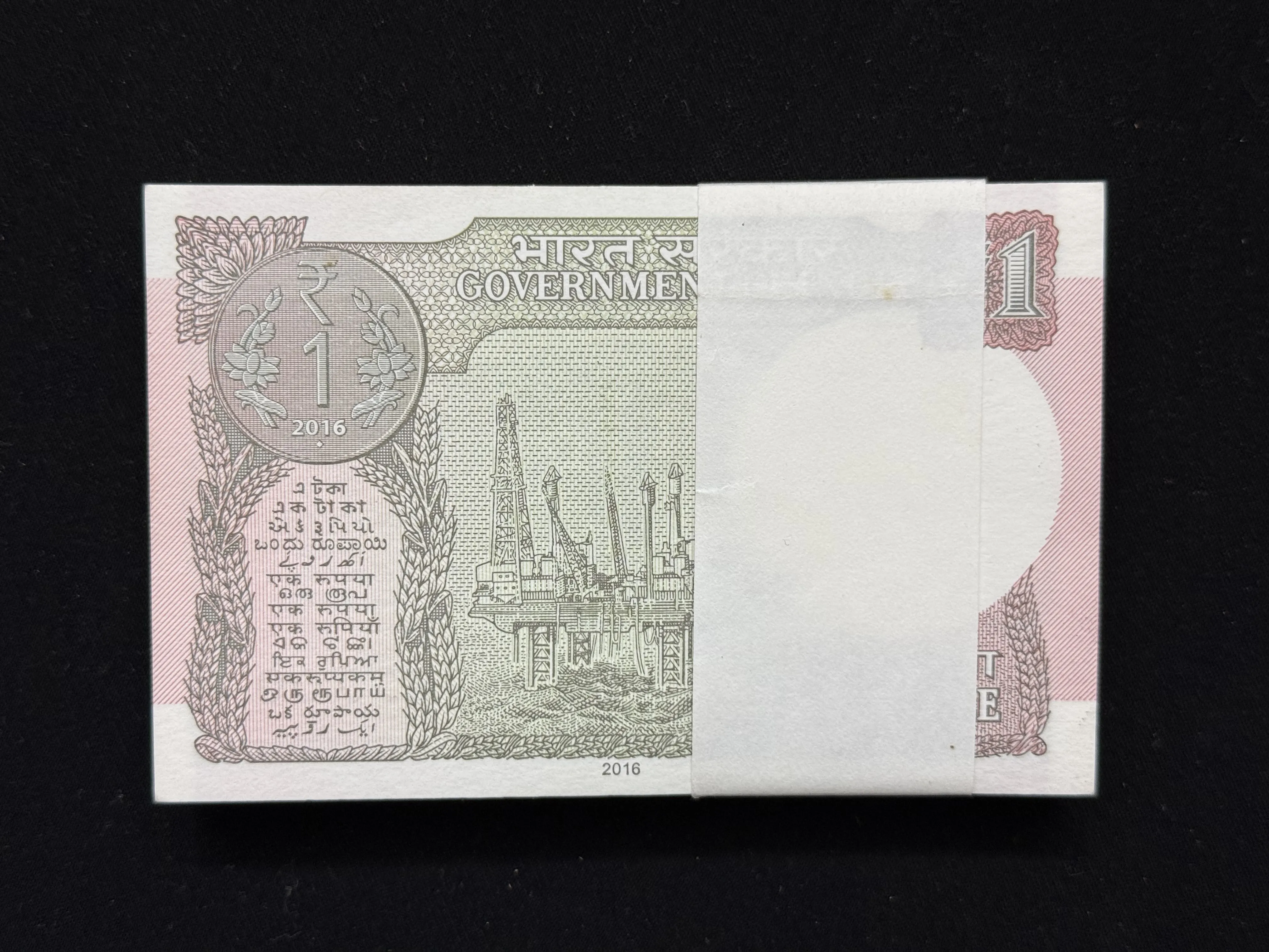 India, 2016 Rupee 1 Complete Serial Bundle of 100 Notes, Fancy Ladder Serial Number 987654, Holy Fancy Serial Number 687 (Reverse 786), Sign. Ratan P. Watal, SCARE, UNC, (84A 987601)