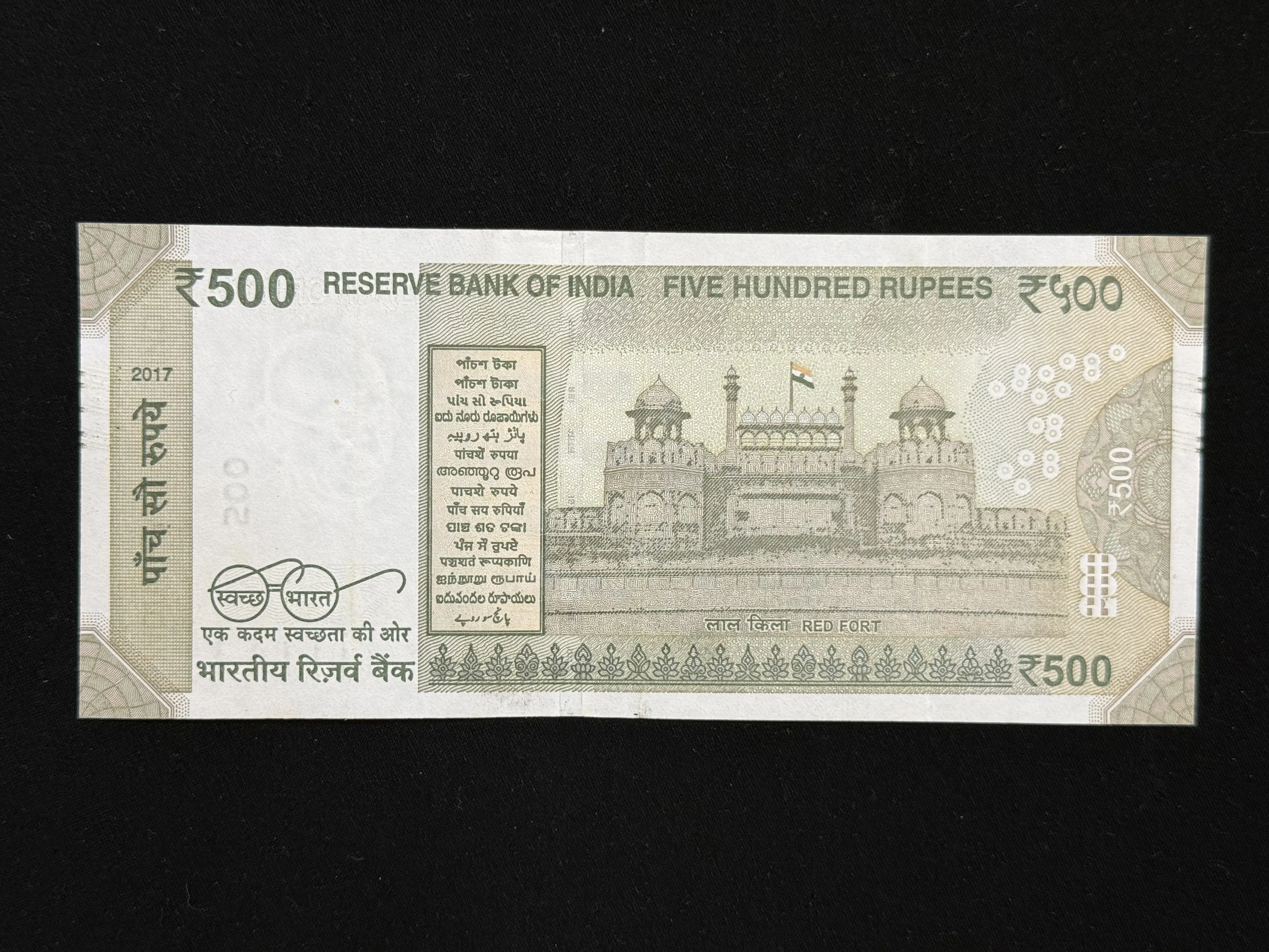 India, 2017 Rupees 500 Banknote, Solid Fancy Serial Number 111111, Sign. Urjit R. Patel, Inset L, AUNC, (6RT 111111)