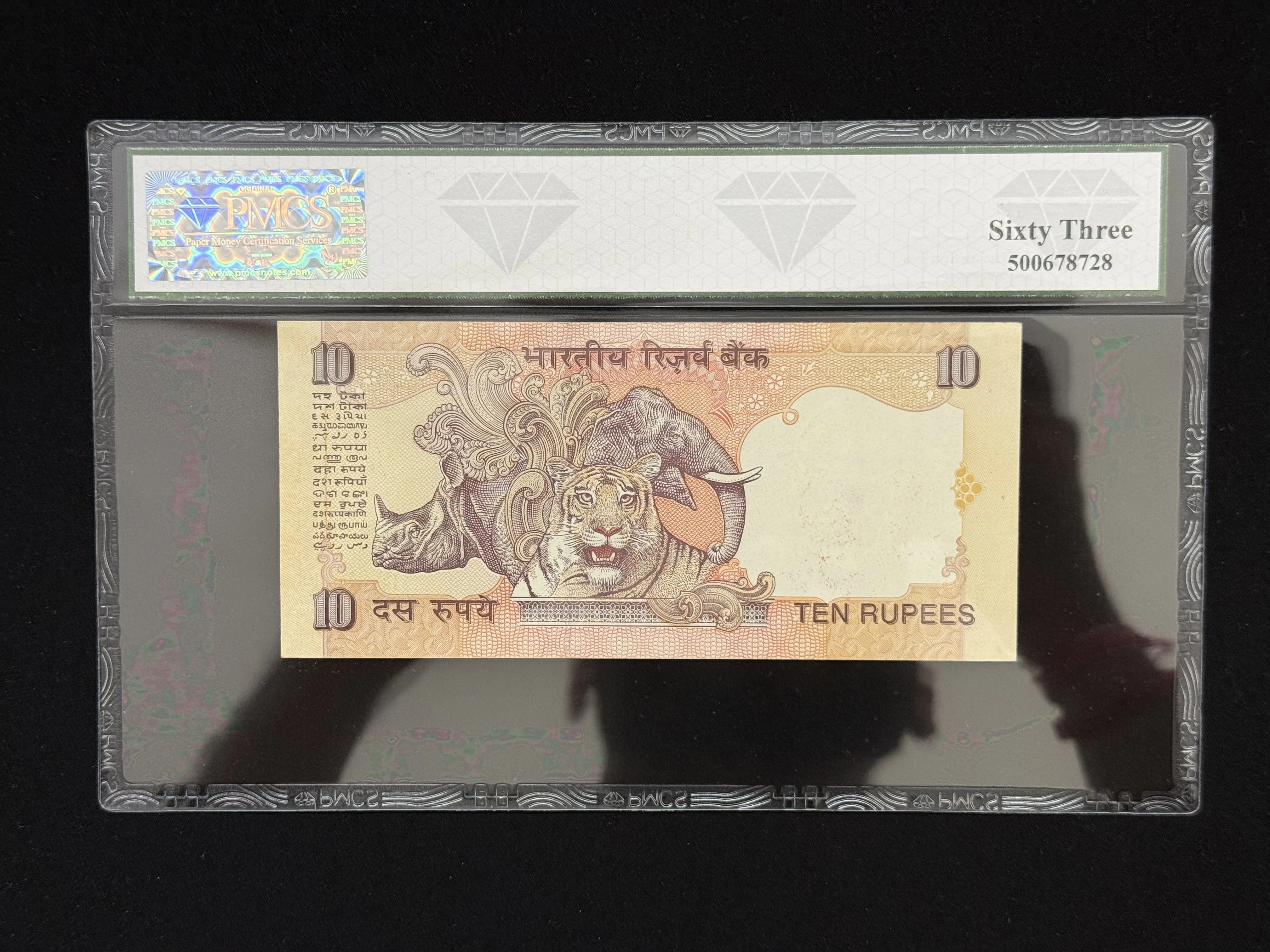 India, Rupees 10 Banknote, Fancy Serial Number 100000, Sign. Y. V. Reddy, PMCS Graded 63 UNC, (99M 100000)