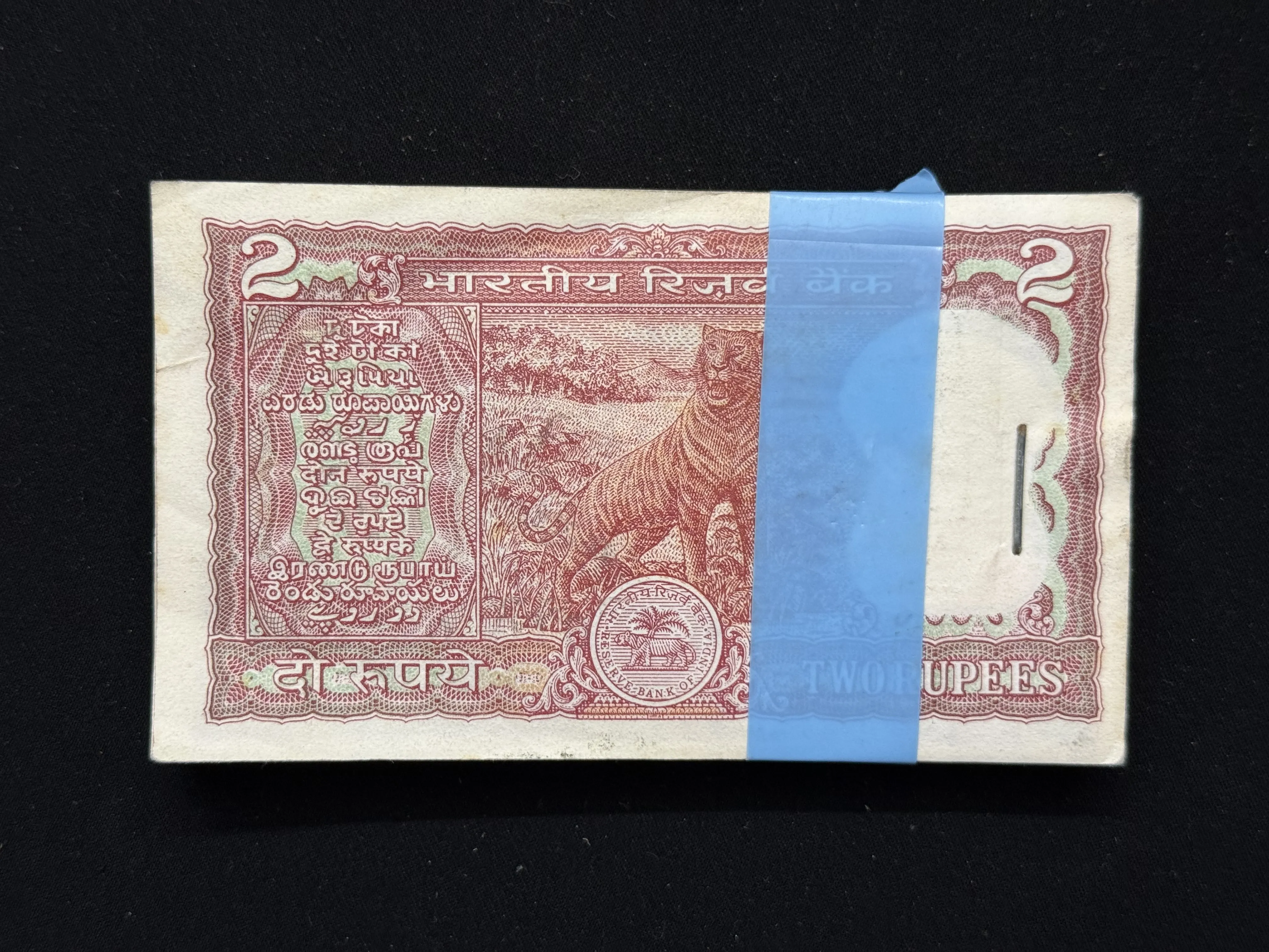 India, Rupees 2 Complete Bundle of 100 Notes, Fancy Mirror Serial Number 089-980, Fancy Serial Number 090000, Standing Tiger Issue, Sign. S. Venkitramanan, Inset B, UNC, (01C 089901)