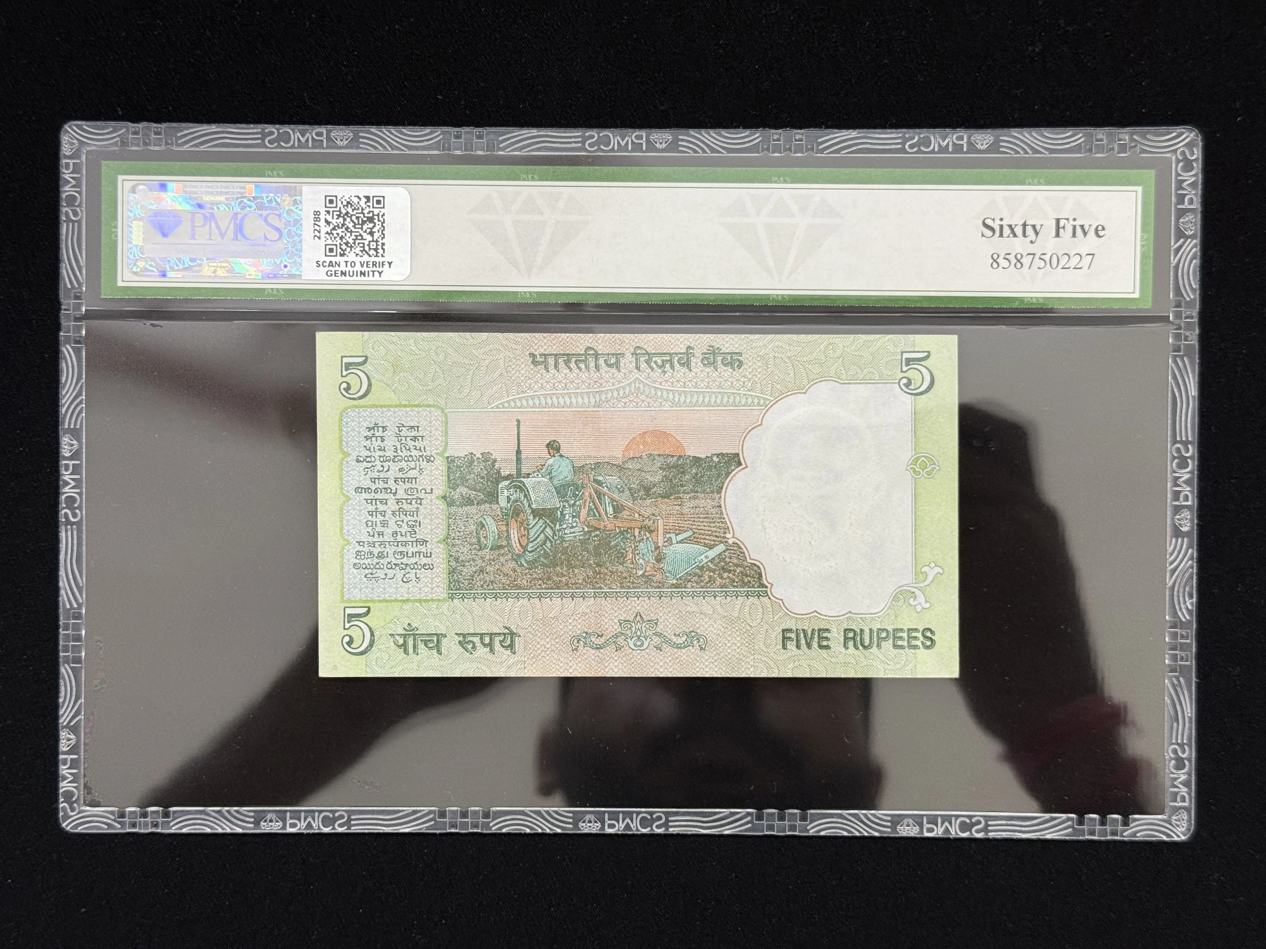 India, Rupees 5 Banknote, Fancy Serial Number 900000, Sign. Bimal Jalan, Inset L, PMCS Graded 65 Gem UNC, RARE, (22K 900000)