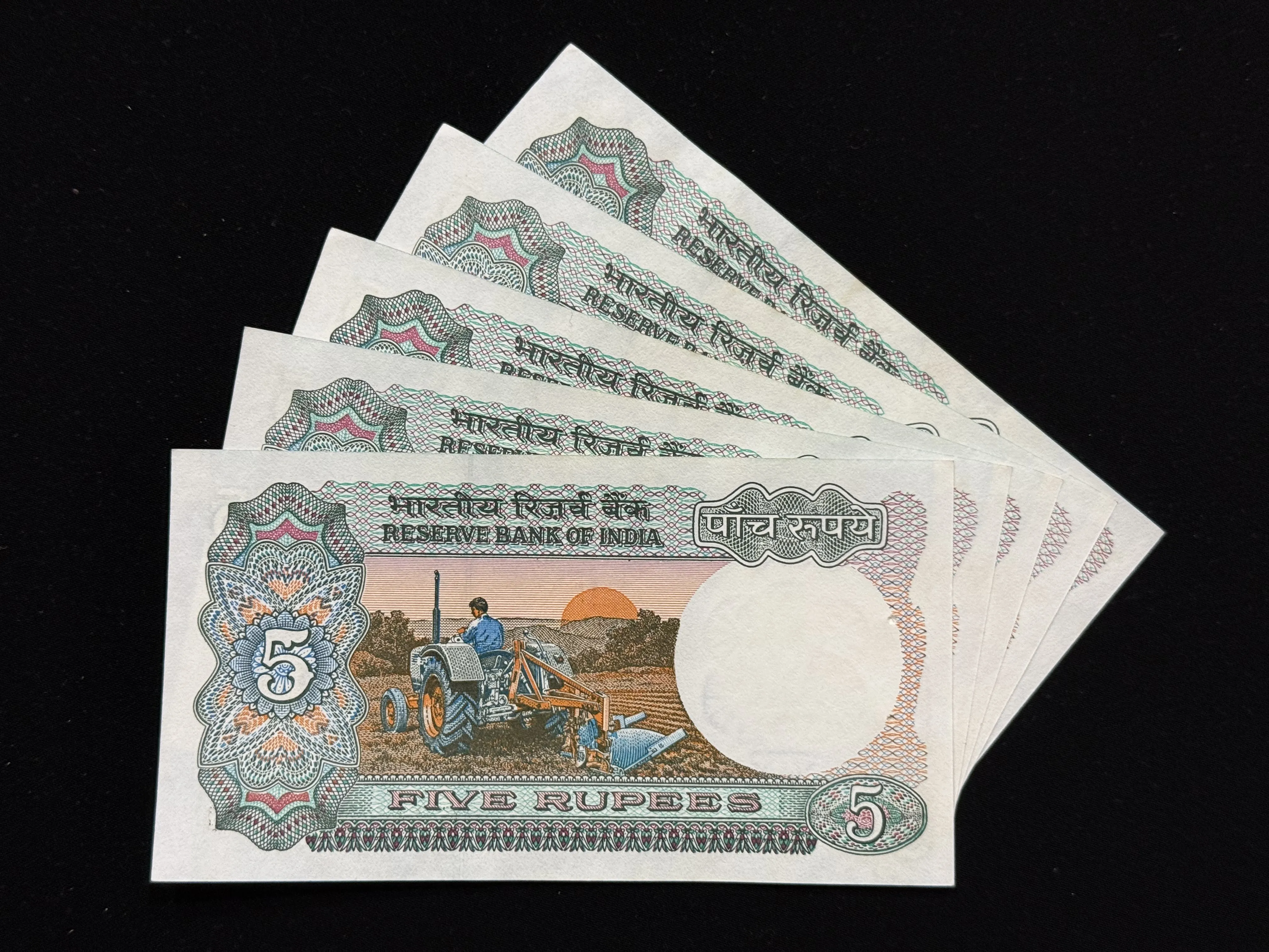 India, Rupees 5 x 5 Consecutive Serial Number Banknotes, Holy Fancy Serial Number Starting 786, Tractor Issue, Sign. R. N. Malhotra, Inset E, UNC, (53A 786736)