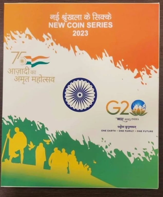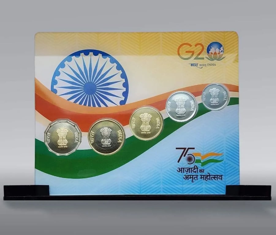 2023 azadi ka amrit mahotsav 5 coins unc set in acrylic stand packing issued by mumbai mint