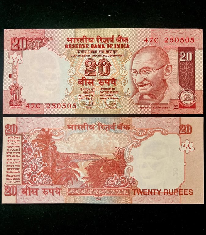 E26 Rs 20 India Banknote Signature Series by Y V Reddy Inset Plain 2008 Issue