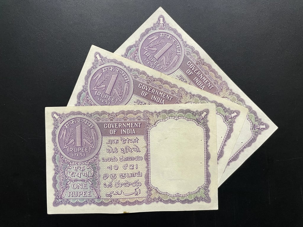 India, 1951 Rupee 1 Banknote x 3 Consecutive Lower Serial Notes, Sign. H. M. Patel