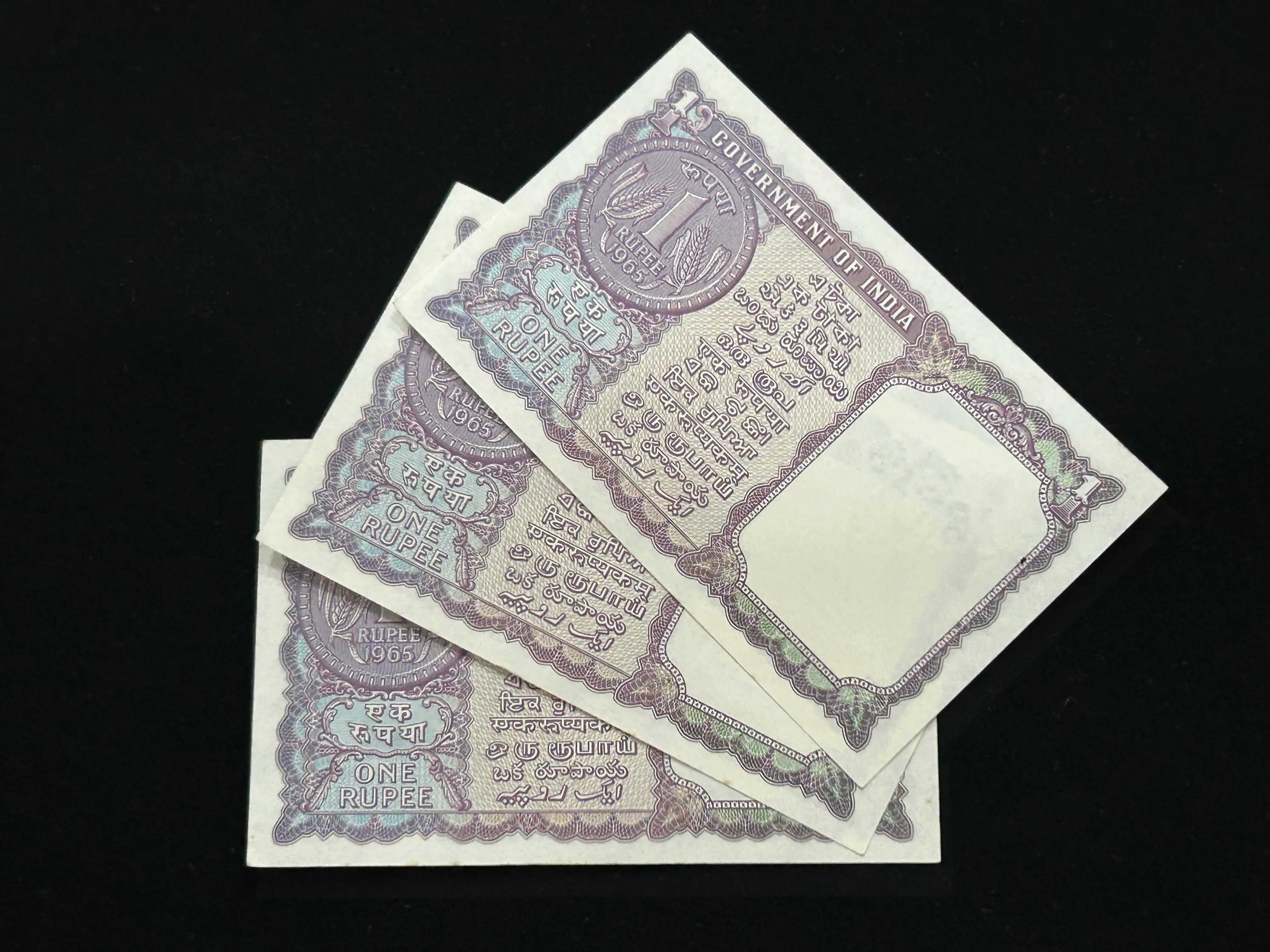 India, 1965 Rupee 1 x 3 Consecutive Serial Number Banknotes, Sign. S. Bhoothalingam, Inset B, UNC, (C63 620740)