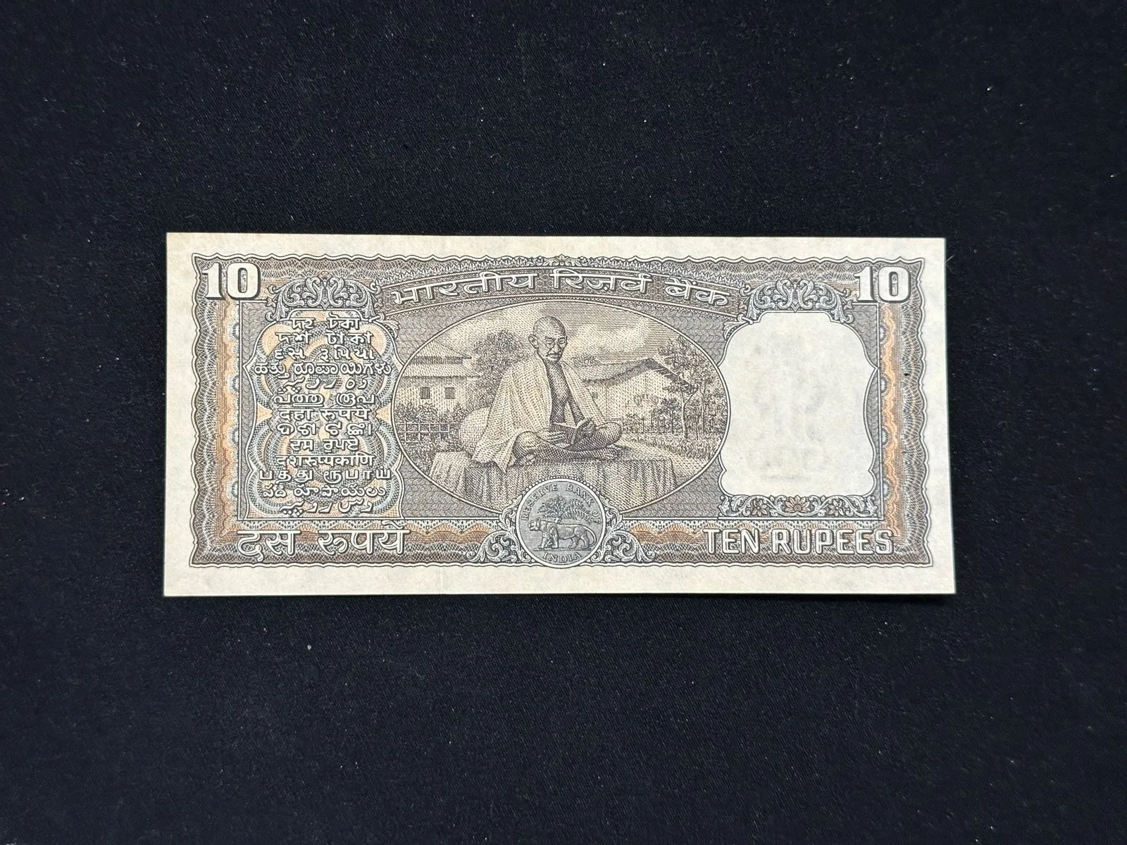 India, 1970 Rupee 10 Banknote, Fancy Mirror Serial Number 346-643, Gandhi Issue, Sign. B.N. Adarkar, AUNC, RARE, (K44 346643)