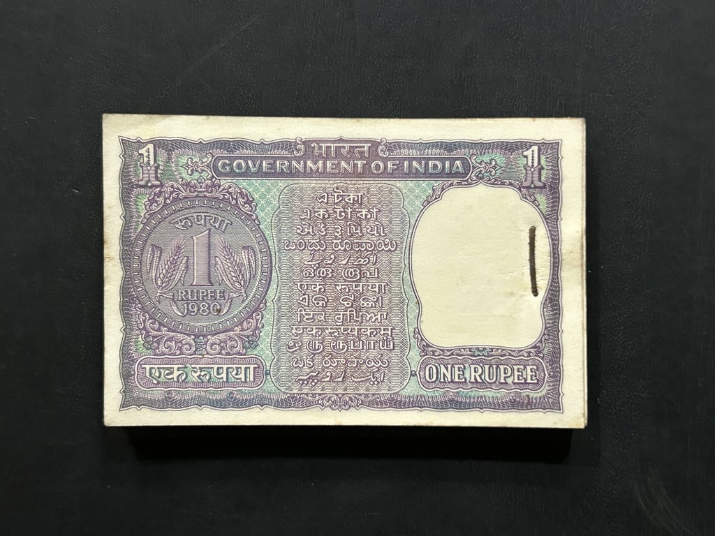 India, 1980 Rupee 1 Complete Serial Bundle of 100 Notes, Fancy Serial Number Ending 801 (Reverse 108) & 888, Sign. R.N. Malhotra Inset A