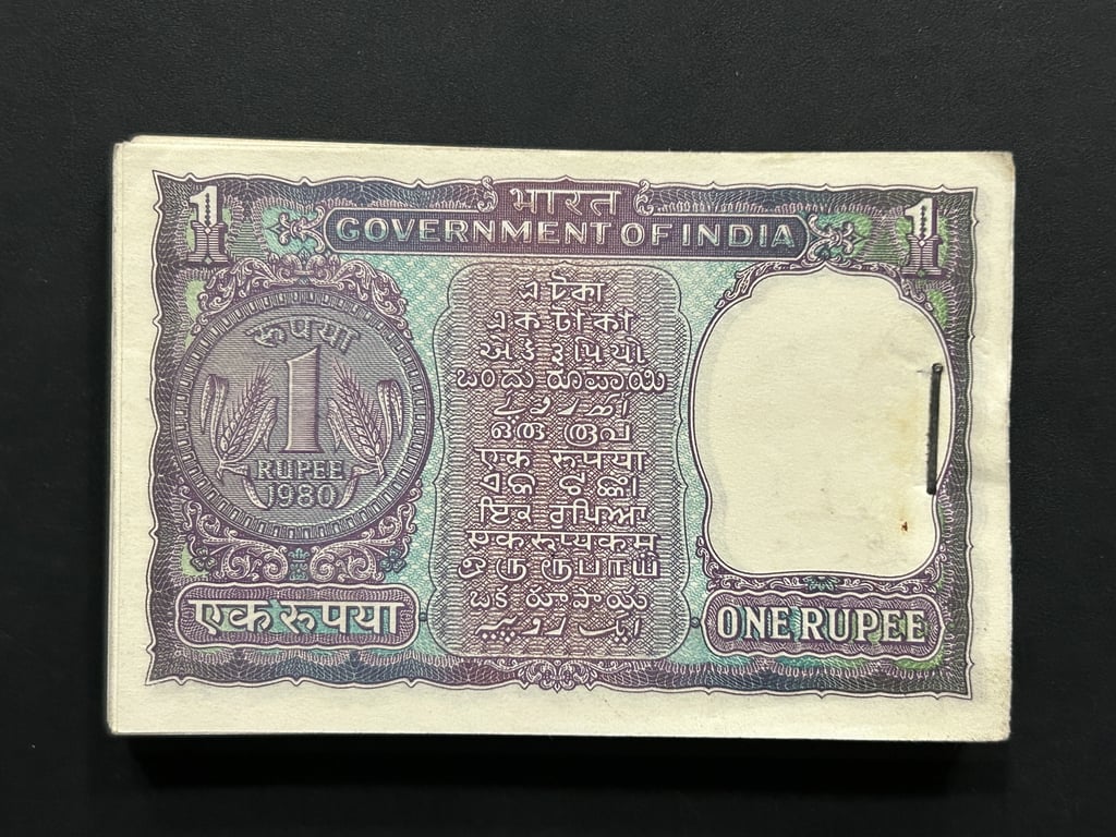 India, 1980 Rupee 1 Complete Serial Bundle of 100 Notes, Holy Fancy Serial Number Starting 214 (RAM), Fancy Mirror Serial Number 214-412 (RAM - RAM), Sign. R.N. Malhotra, Inset B