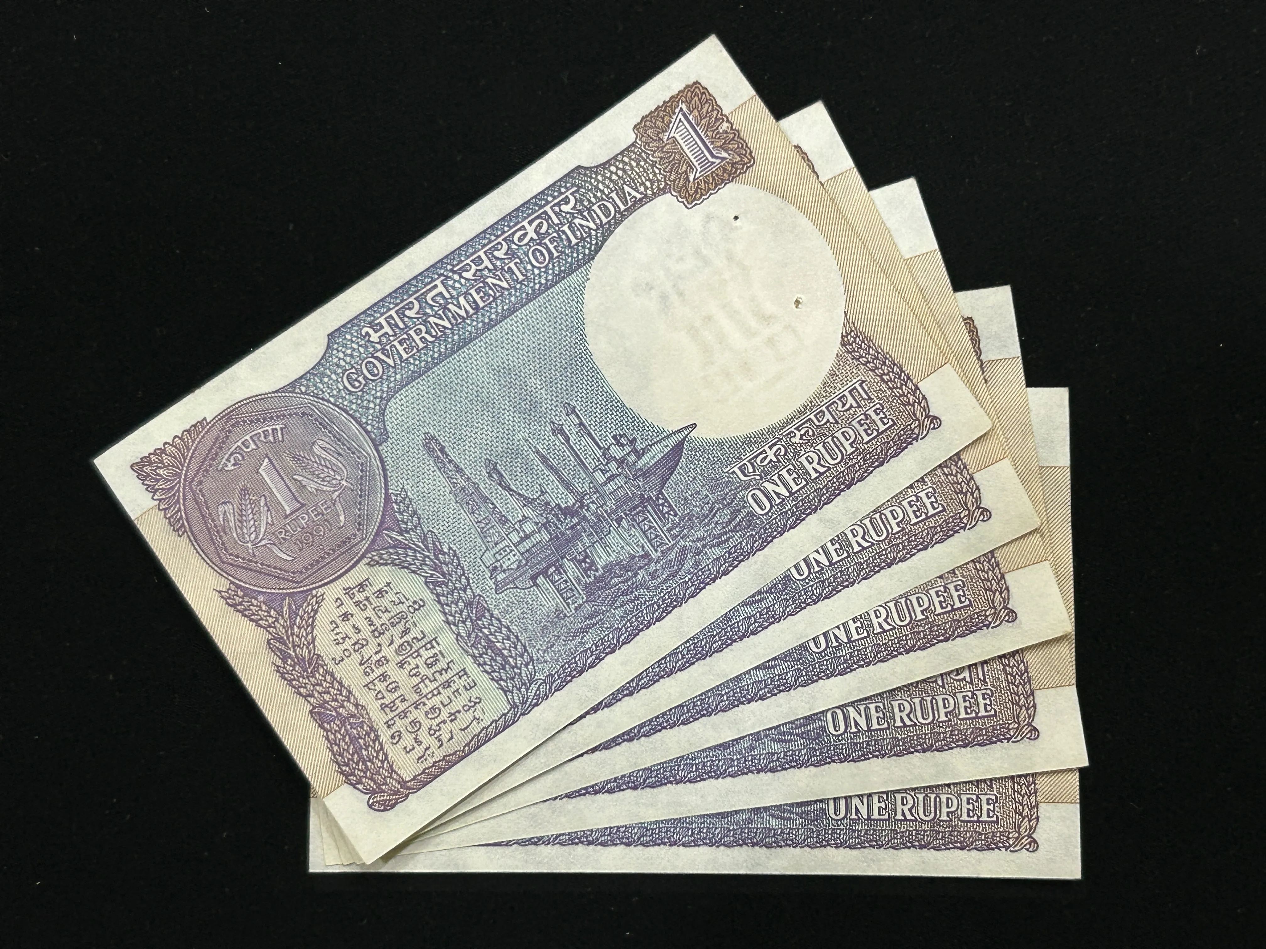 India, 1991 Rupee 1 x 5 Consecutive Serial Number Banknotes, Sign. S.B. Shukla, Inset B, UNC, (18H 370791)