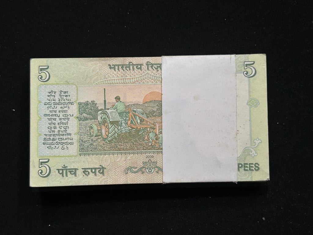 India, 2009 Rupees 5 Complete Starting Bundle Serial Number Fancy 916 (Hallmark) (Reverse 619) of 100 Notes, Holy Fancy Serial Number Ending 786 & 777, Gandhi Series, Sign. D. Subbarao, Inset L, UNC