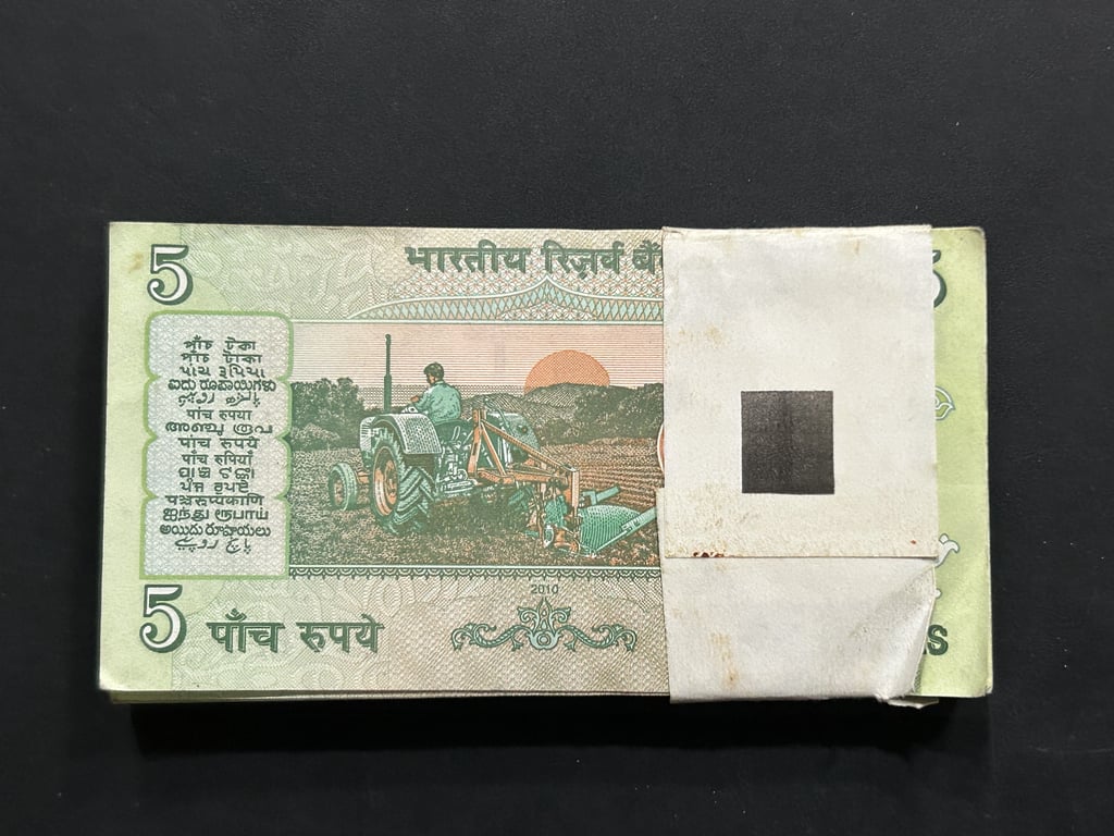 India, 2010 Rupees 5 Complete Serial Bundle of 100 Notes, Fancy Serial Number Ending 916 & 999, Fancy Mirror Serial Number 309-903, Gandhi Series, Sign. D. Subbarao, Inset L
