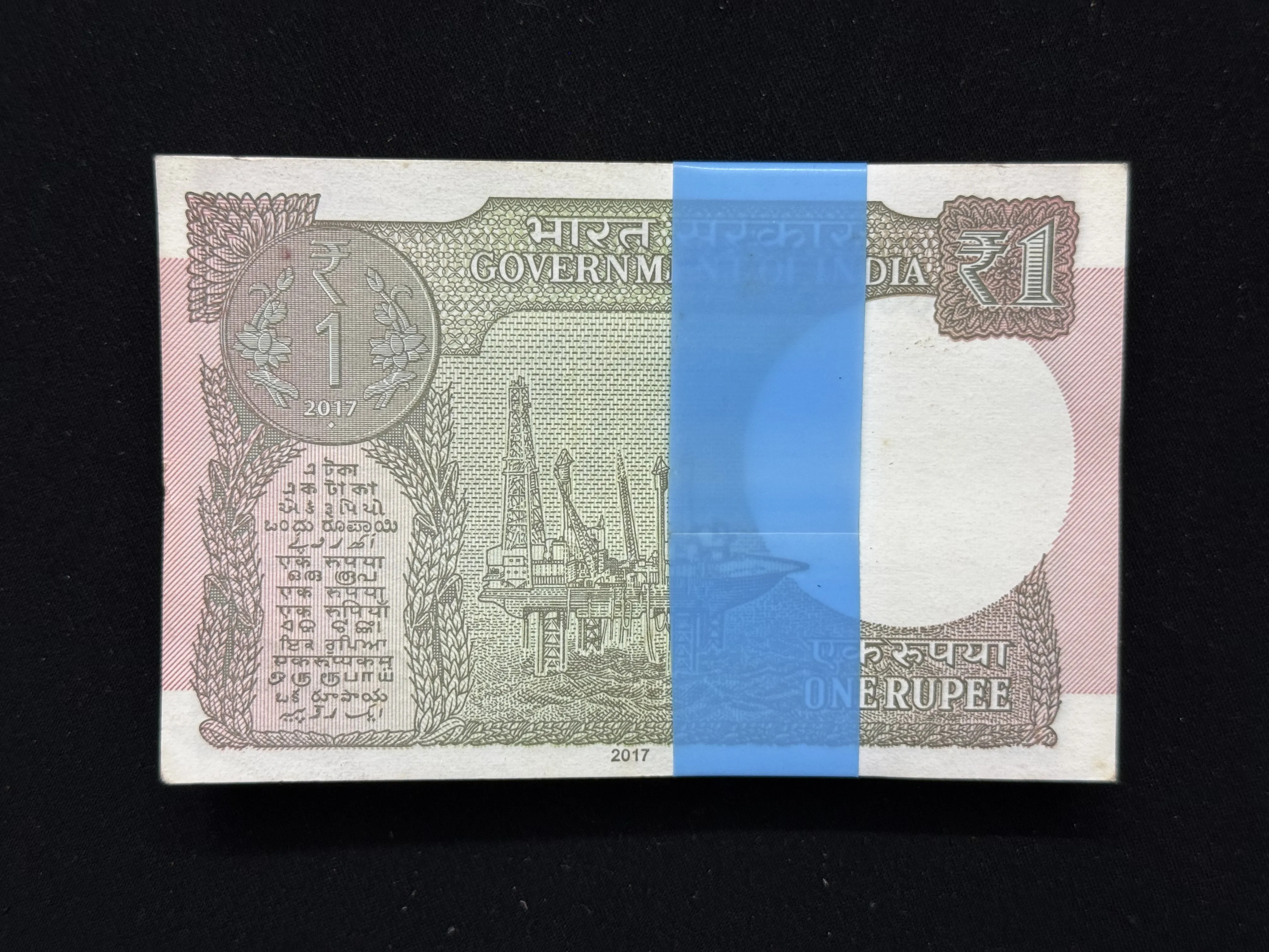 India, 2017 Rupee 1 Complete Bundle of 100 Notes, Fancy Mirror Serial Number 119-911, Fancy Serial Number Ending 916 (Hallmark), Sign. Shaktikanta Das, Inset L, UNC, (15B 119901)