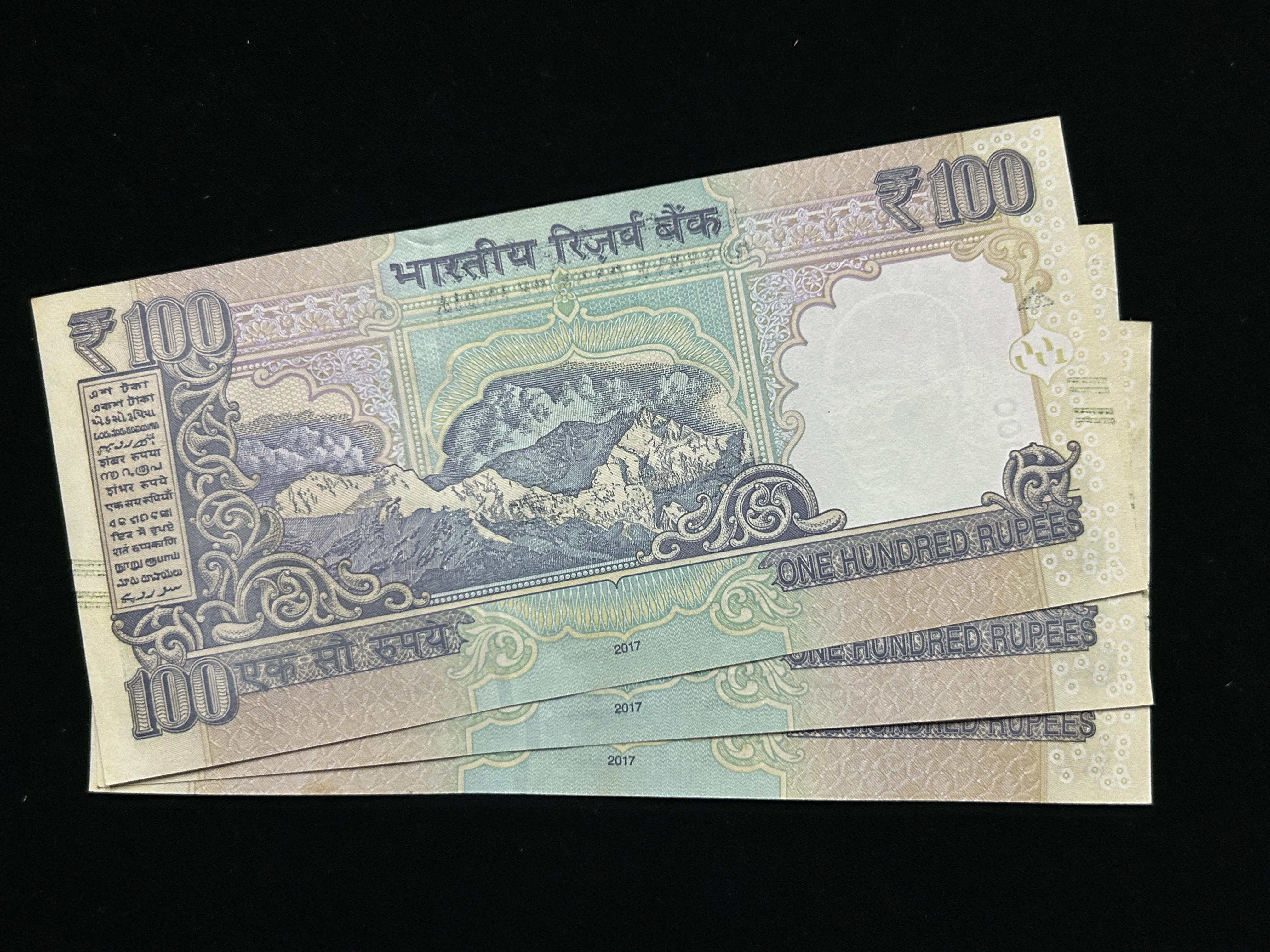 India, 2017 Rupees 100 x 3 Banknotes, Set Of Fancy Serial Number 143-420, 214-420, 687-420, Sign. Urjit R. Patel, Inset E, UNC, (8BA 143420)