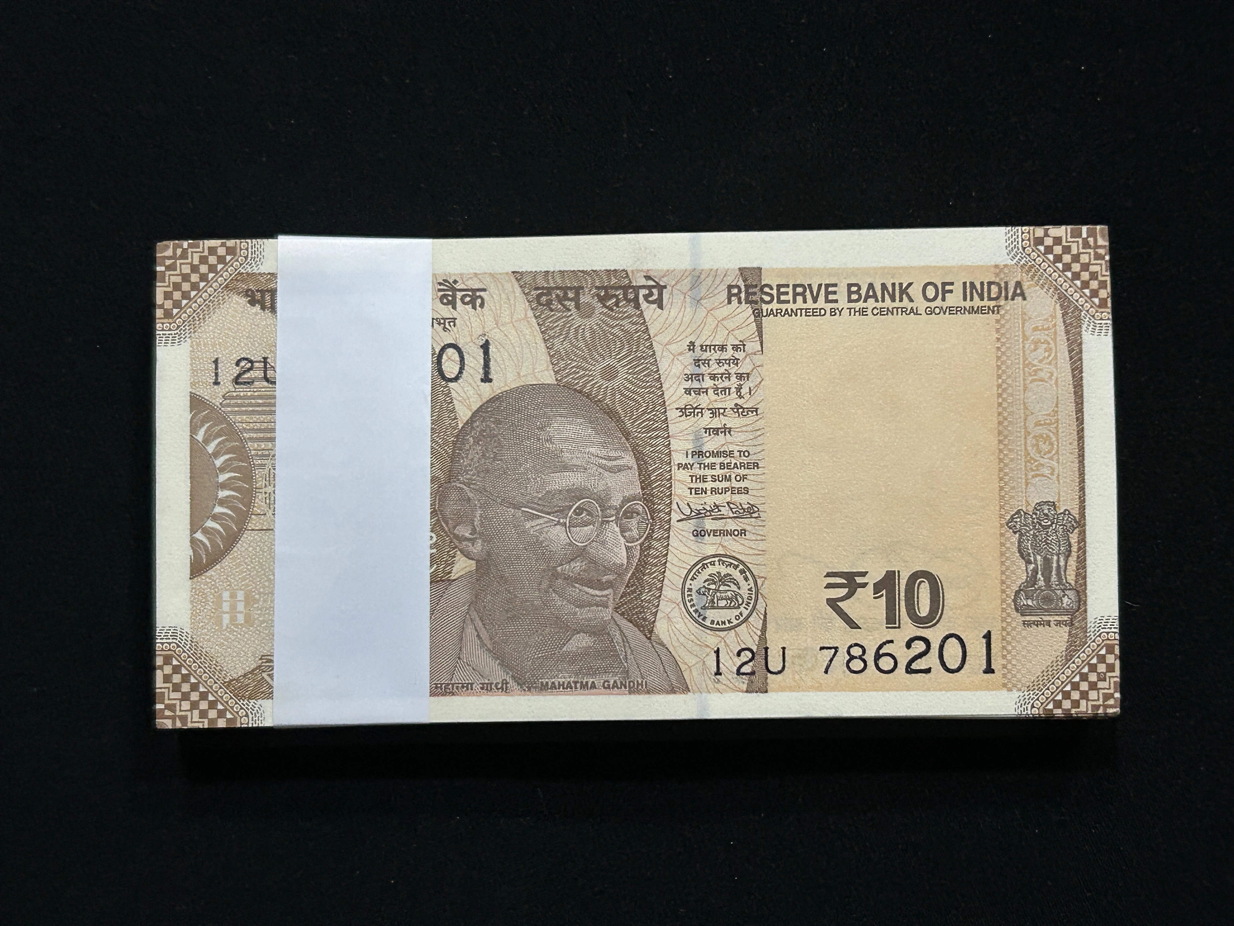 India, 2018 Rupees 10 Complete Serial Bundle of 100 Notes, Holy Fancy Serial Number Starting 786 & Fancy Serial Number Ending 007 (James Bond) - 786007, Sign. Urjit R. Patel, Inset R, UNC