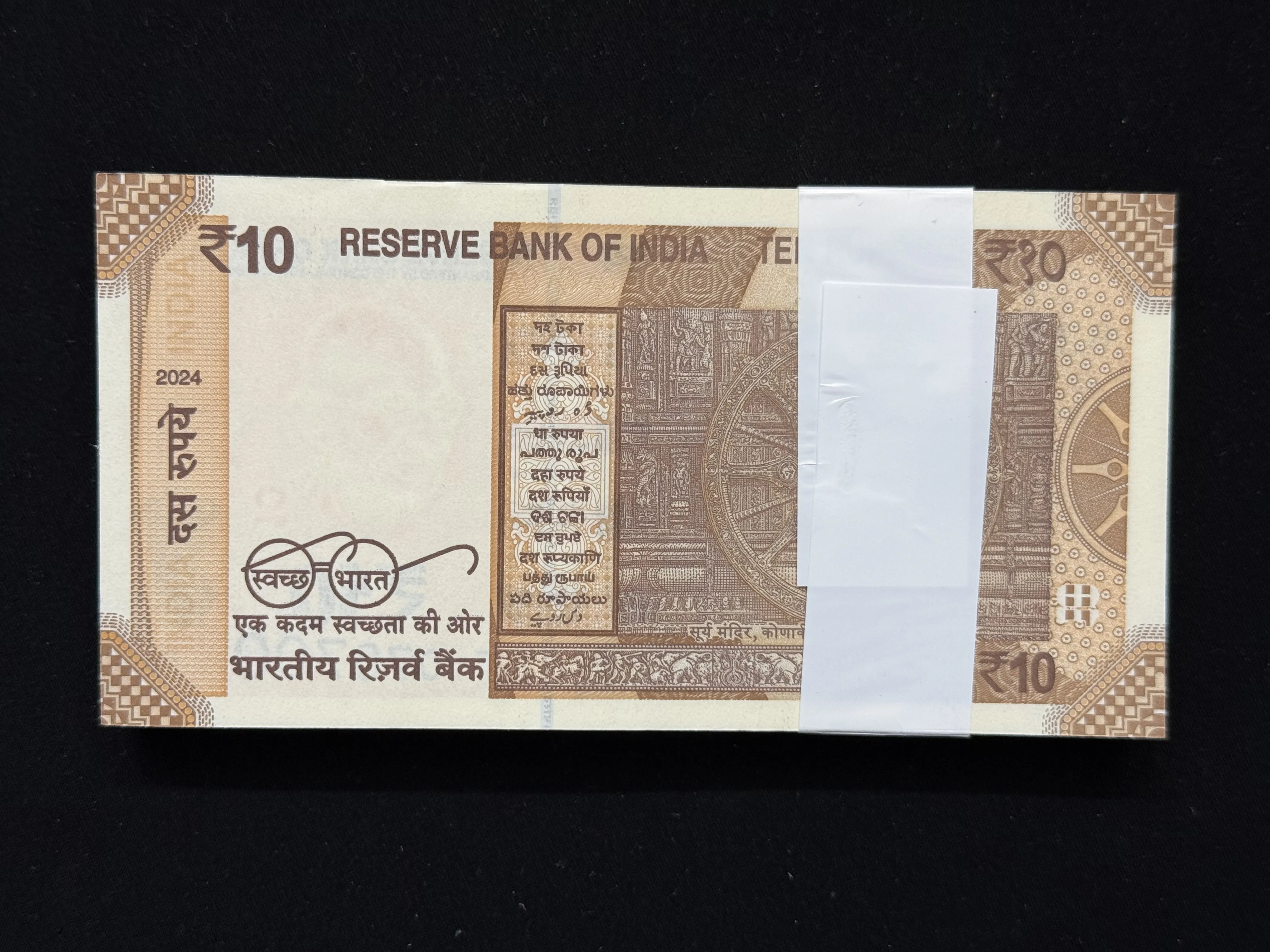 India, 2024 Rupees 10 Complete Bundle of 100 Notes, Double Holy Fancy Serial Number (Middle 786) x78687 (Ending Reverse 786), Sign. Shaktikanta Das, Inset R, UNC, (82T 078601)