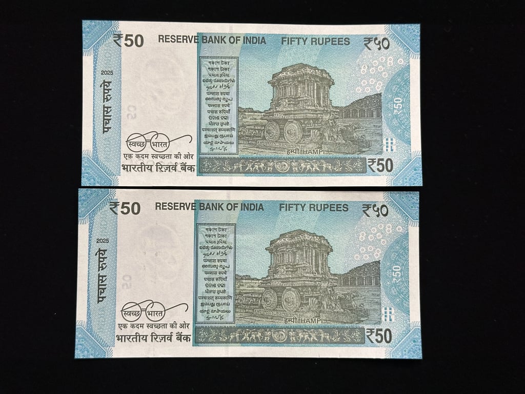 India, 2025 Rupees 50 x 2 Banknotes, Set Of Solid Fancy Serial Number 999999 & 1000000 (One Million), Sign. Sanjay Malhotra, Inset L, UNC