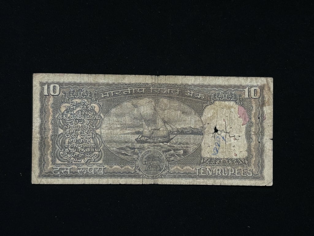 India, Rupees 10 Banknote, Black Boat Issue, Fancy Serial Number 900000, Sign. R.N. Malhotra, Inset G, Used Condition