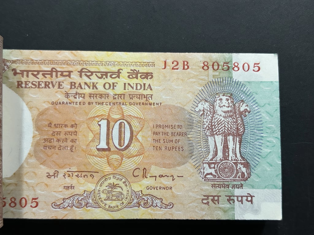 India, Rupees 10 Complete Serial Bundle of 100 Notes, Fancy Doubling Serial Number 805-805 & Fancy Serial Number Number Ending 805 - 888, Shalimar Issue, Sign. C. Rangarajan, Inset E
