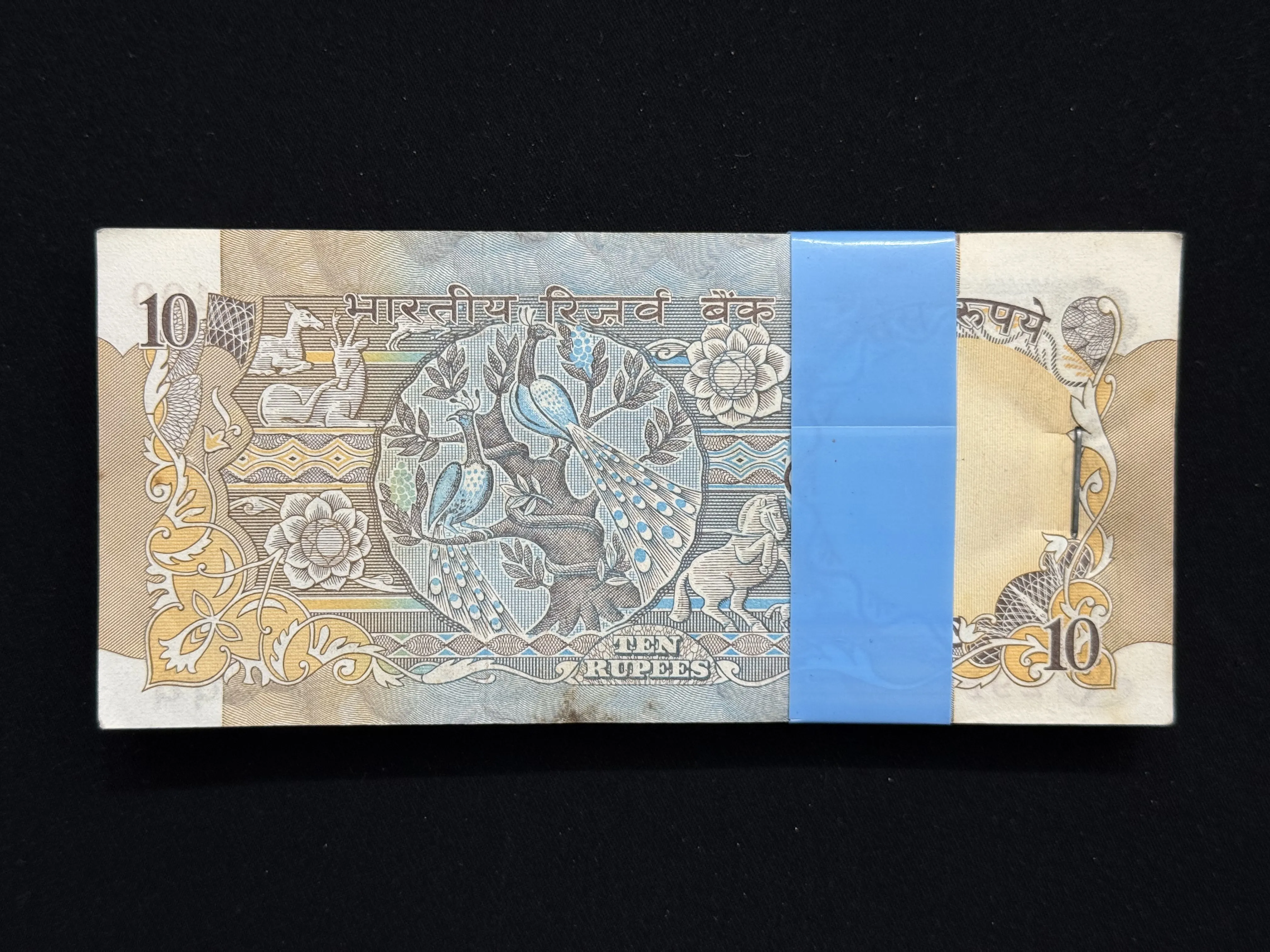 India, Rupees 10 Complete Serial Bundle of 100 Notes, Fancy Serial Number Ending 365, Peacock Issue, Sign. I. G. Patel, Inset A, (29F 548301)