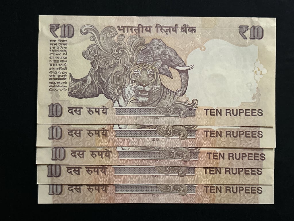 India, Rupees 10 x 5 Banknotes, Fancy Same Lower Serial Number 000021, Sign. D. Subbarao & Raghuram G. Rajan, UNC