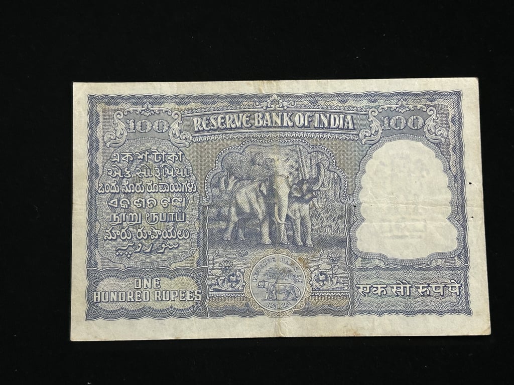 India, Rupees 100 Banknote, Elephant Issue (3rd Issue), Sign. B. Rama Rau, Red Serial, Prefix H (Calcutta Circle)