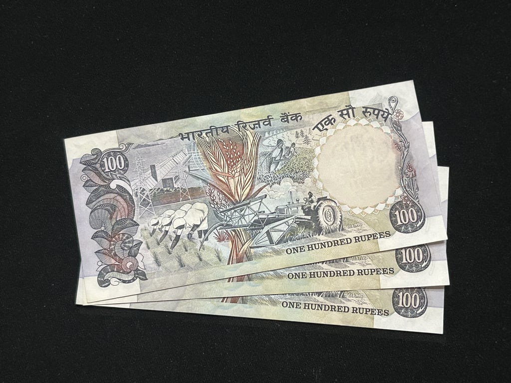India, Rupees 100 x 3 Consecutive Serial Number Banknotes, Cobalt Blue Issue, Sign. R.N. Malhotra, UNC