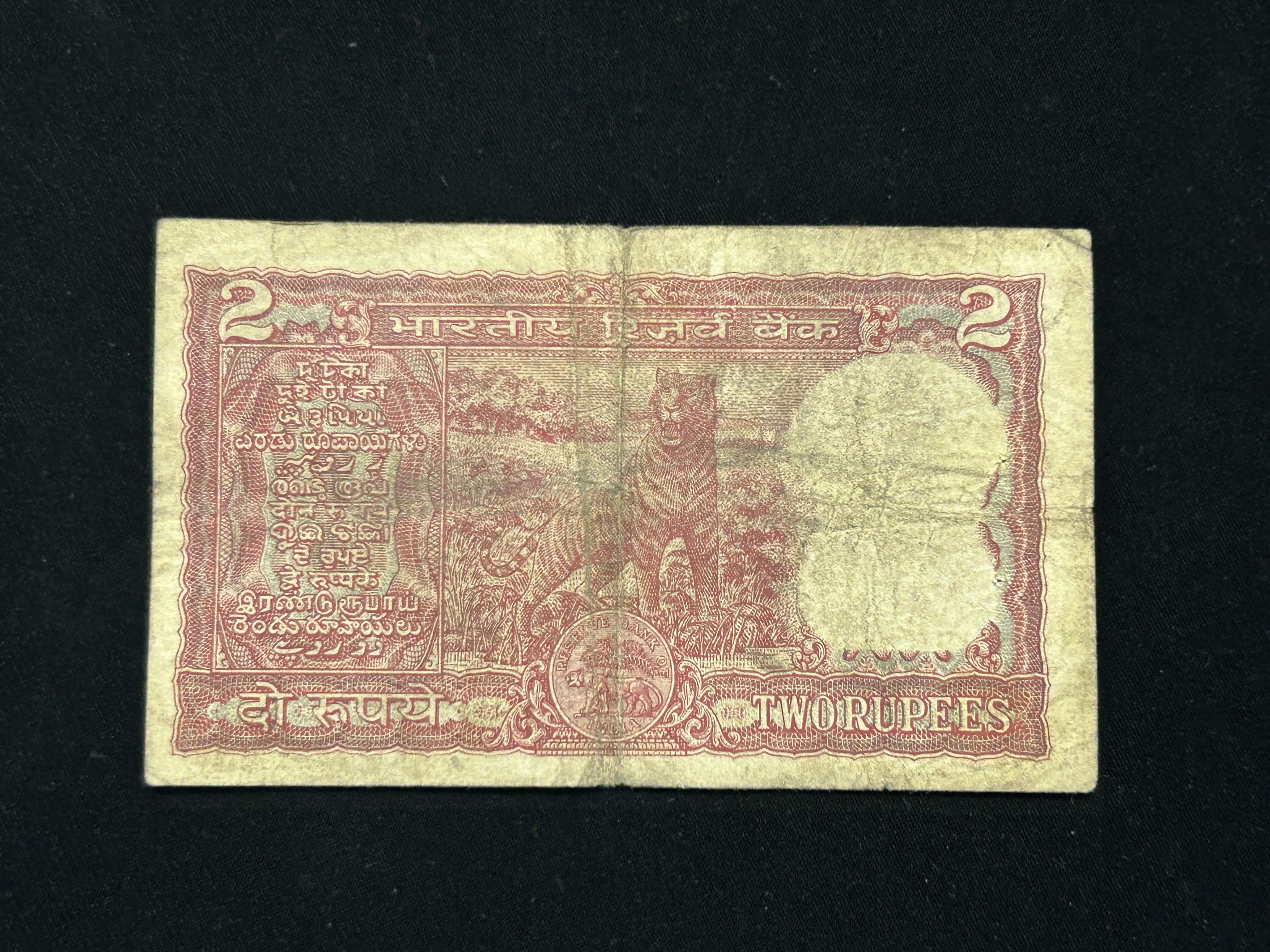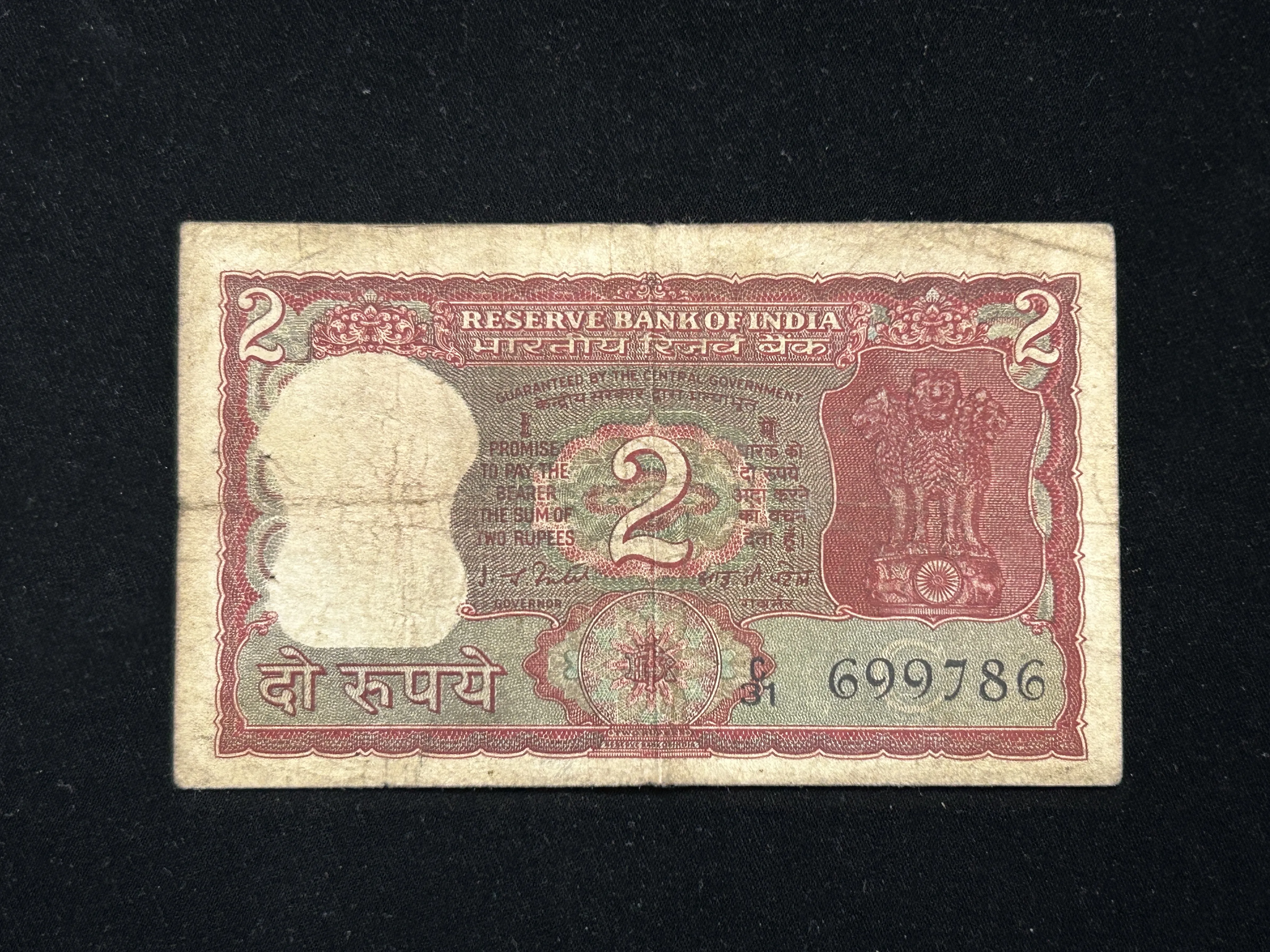 India, Rupees 2 Banknote, Holy Fancy Serial Number Ending 786, Standing Tiger Issue, Sign. I. G. Patel, Inset C, (C31 699786)