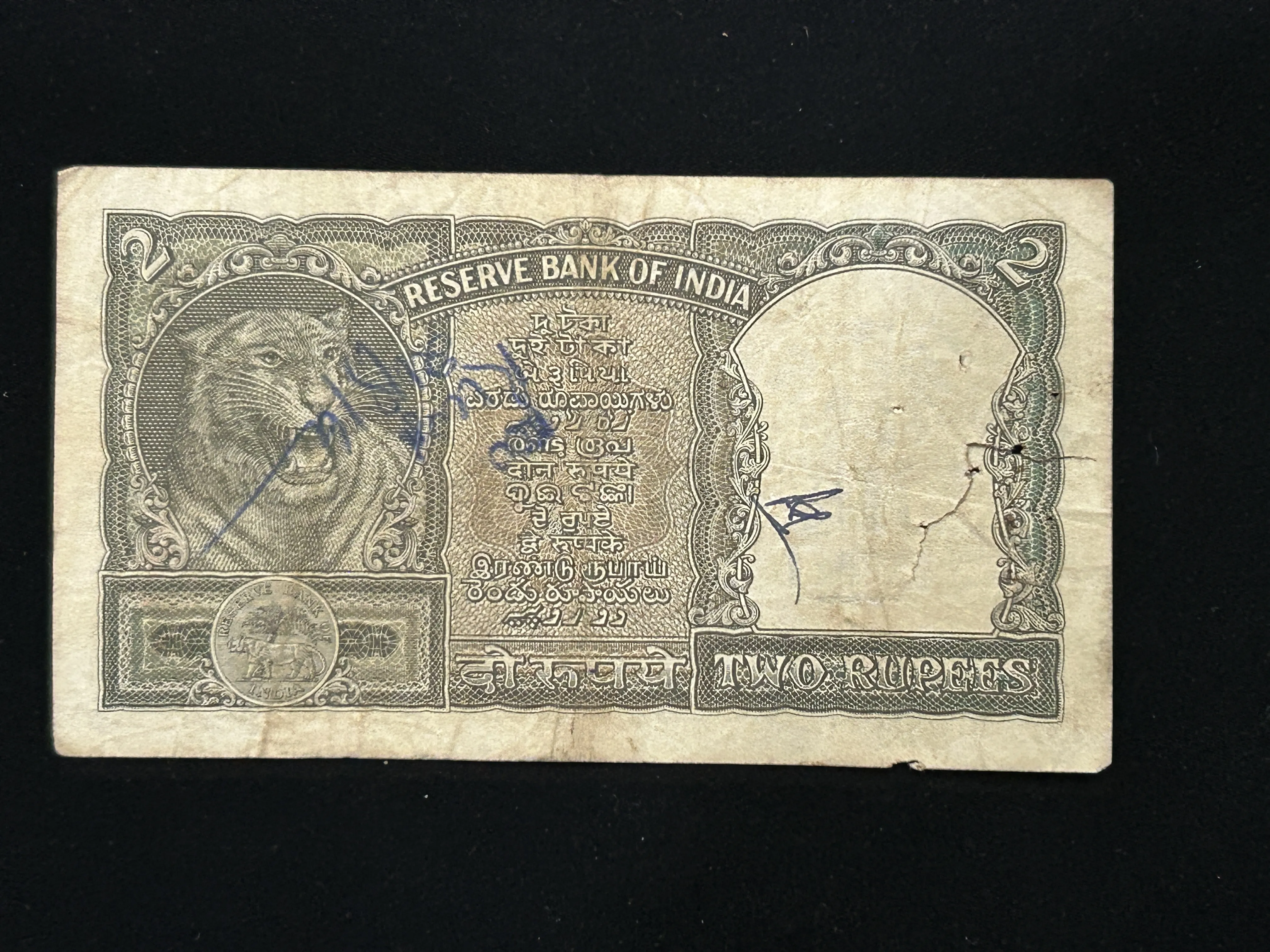 India, Rupees 2 Banknote, Olive Green Issue, Sign. P.C. Bhattacharya, UNC, (F66 161428)