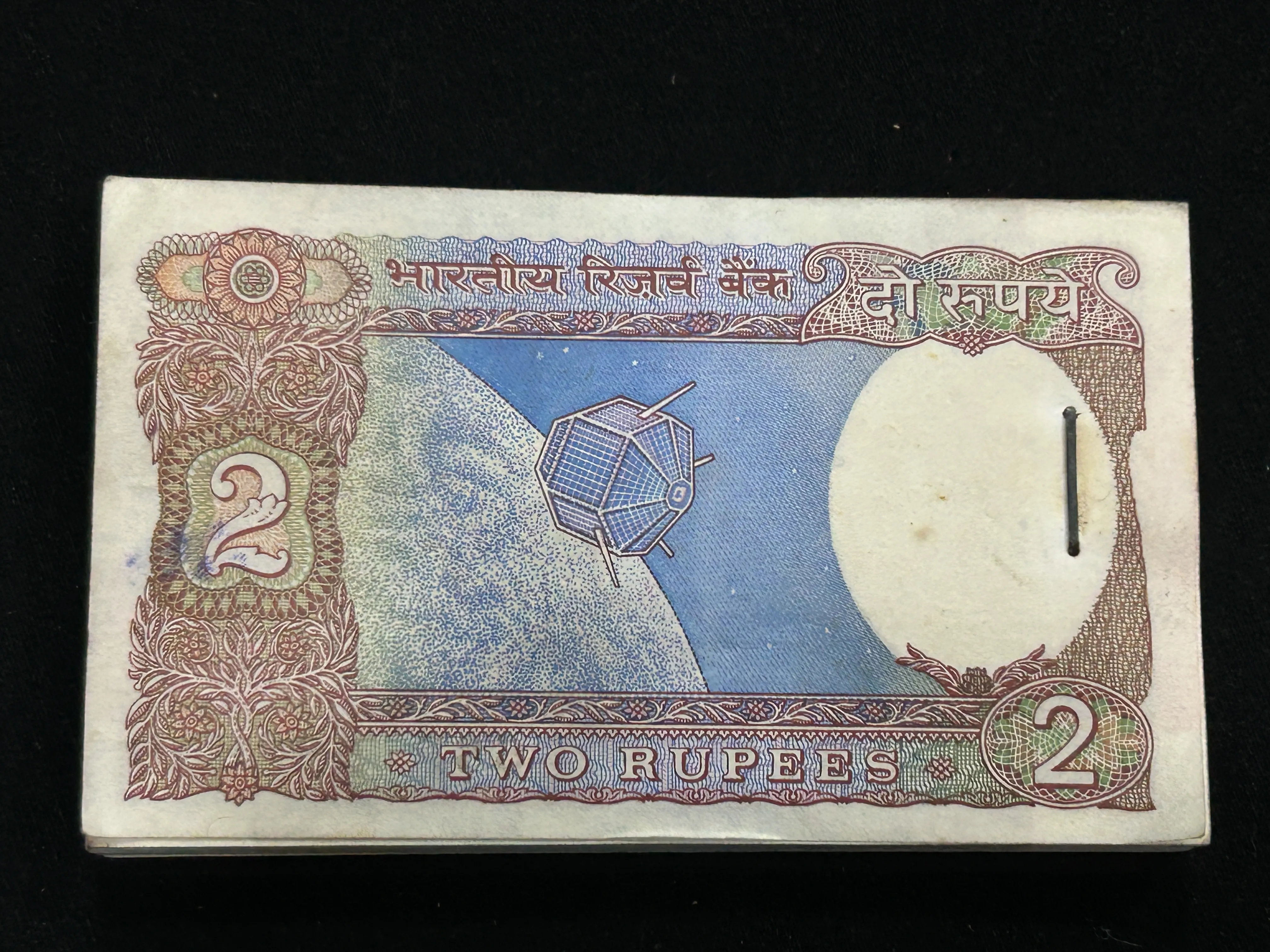 India, Rupees 2 Complete Serial Bundle of 100 Notes, Fancy Doubling Serial Number 598-598, Holy Fancy Serial Number 541 (SAI), Sattelite Issue, Sign. R. N. Malhotra, Inset A, UNC, (68P 598501).