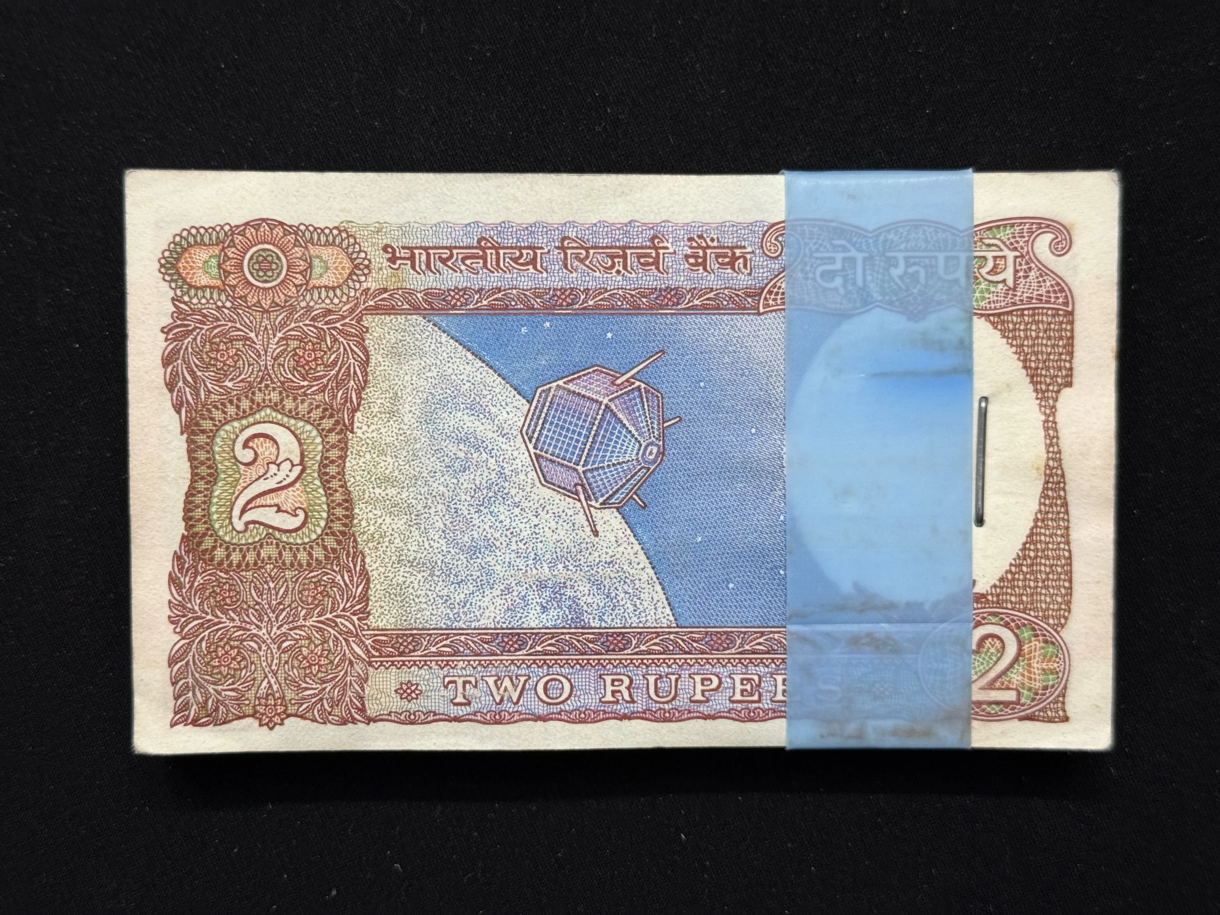India, Rupees 2 Complete Serial Bundle of 100 Notes, Fancy Doubling Serial Number 643-643, Holy Fancy Serial Number Ending 687 (Reverse 786), Satellite Issue, Sign. R.N. Malhotra, (85A 643601).