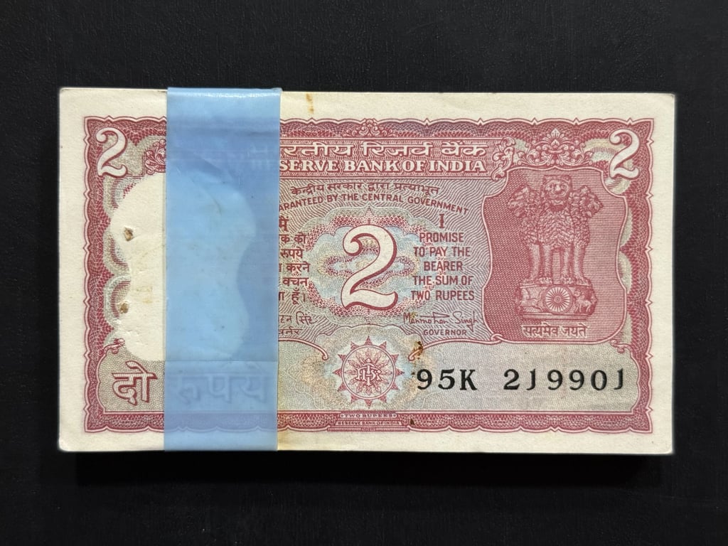 India, Rupees 2 Complete Serial Bundle of 100 Notes, Fancy Mirror Serial Number 219-912 & Semi Fancy Serial Number 220000 & Fancy Serial Number Ending 916 (Hallmark), Standing Tiger Issue, Sign. Manmohan Singh