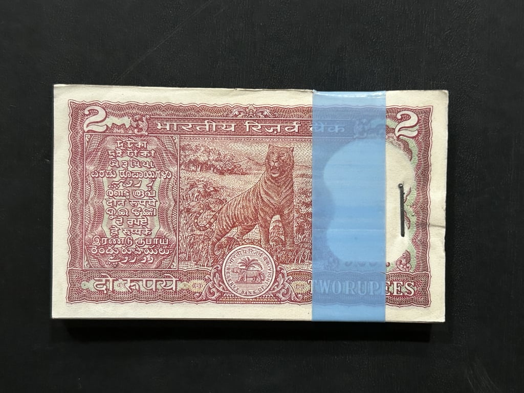 India, Rupees 2 Complete Serial Bundle of 100 Notes, Fancy Serial Number Ending 108 & 143 (I Love You), Standing Tiger Issue, Sign. R.N. Malhotra, Inset A