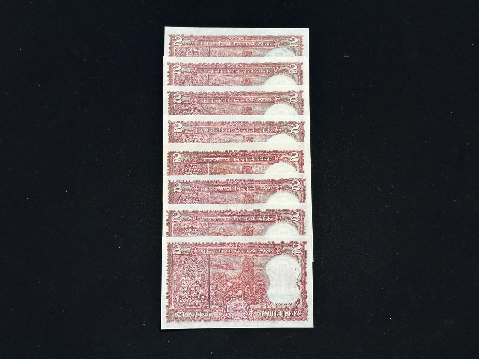 India, Rupees 2 x 8 Banknotes, Set of Fancy Serial Number 76A 777710 - 76A 777790 (76A 777770 Missing), Standing Tiger Issue, Sign. R. N. Malhotra, Inset B, UNC, RARE, (76A 777710)