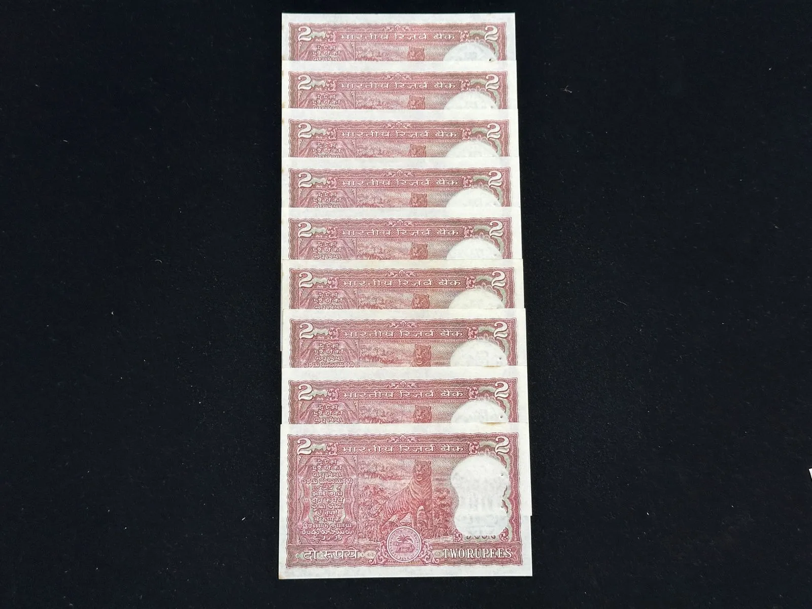 India, Rupees 2 x 9 Banknotes, Set of Fancy Serial Number 76A 777707 - 76A 777797 (76A 777777 Missing), Standing Tiger Issue, Sign. R. N. Malhotra, Inset B, RARE, UNC, (76A 777707)