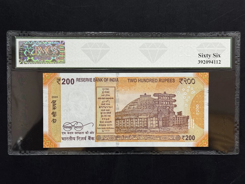 India, Rupees 200 Banknote, Super Solid Fancy Serial Number 6 - 666666, Sign. Shaktikanta Das, PMCS Graded 66 (Gem UNC) Top Grade