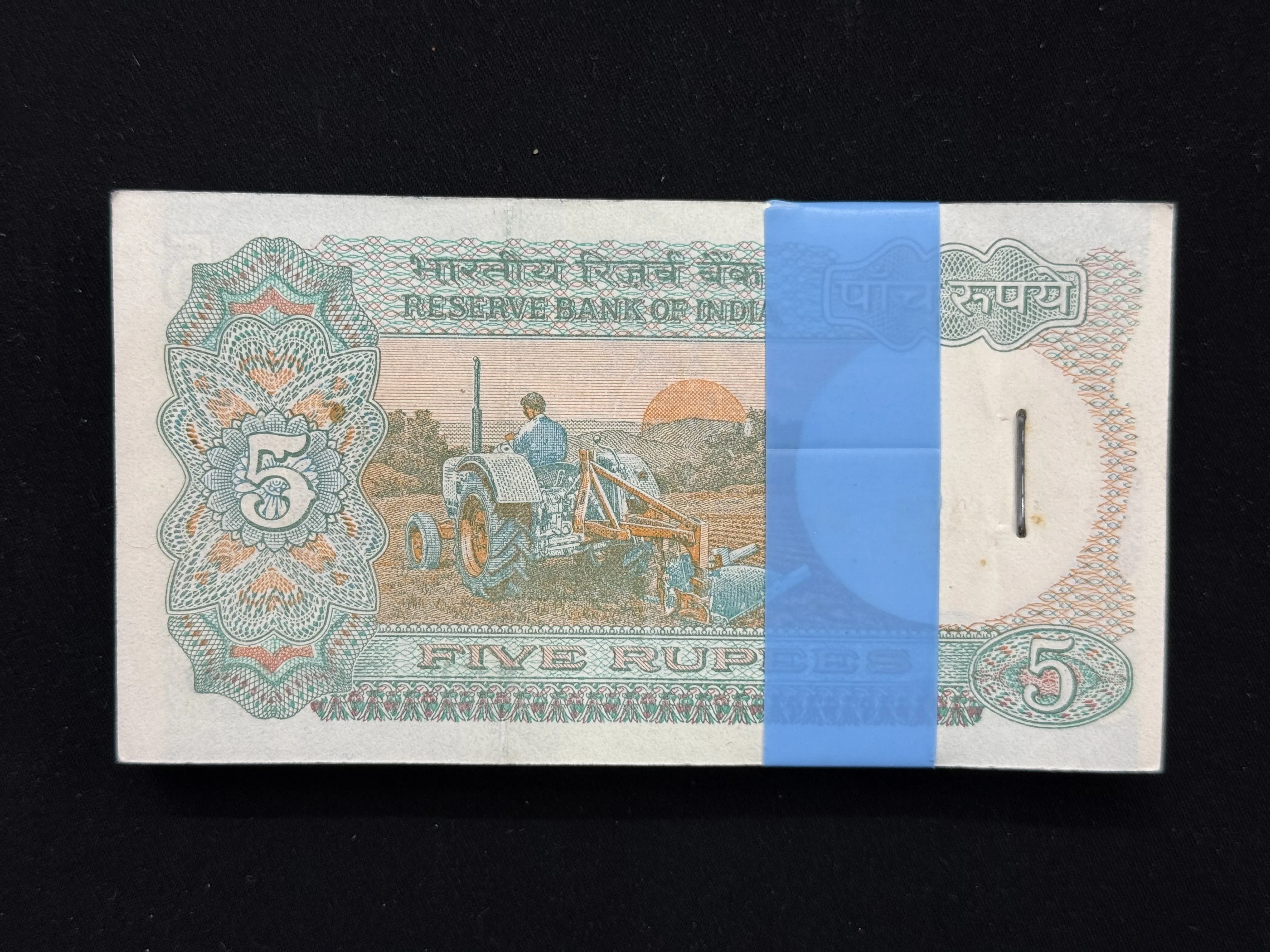 India, Rupees 5 Complete Serial Bundle of 100 Banknotes, Fancy Mirror Serial Number Ending 044-440, Fancy Serial Number 044-420, 044-444, Tractor Issue, Sign. C. Rangarajan, Inset B, (86V 044401).